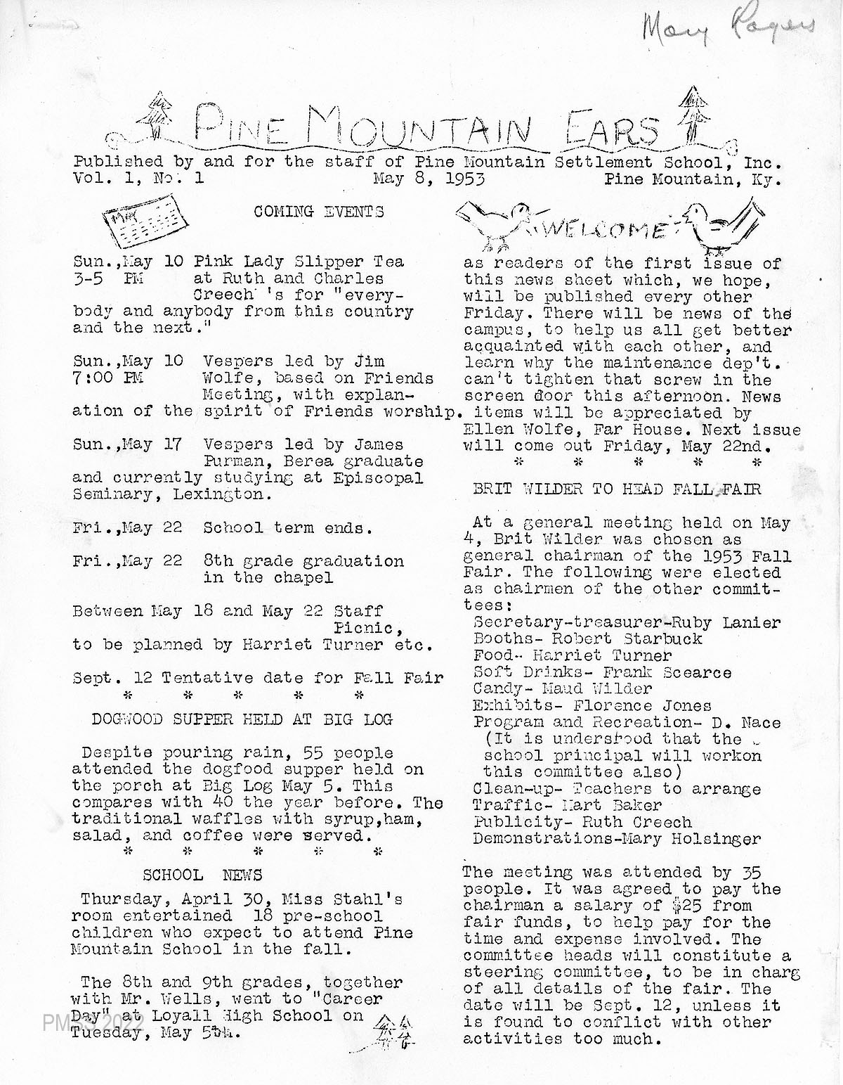 - Pine Mountain Ears, May 8, 1953, p. 1. [pmss_ears_1953_05_08_001]