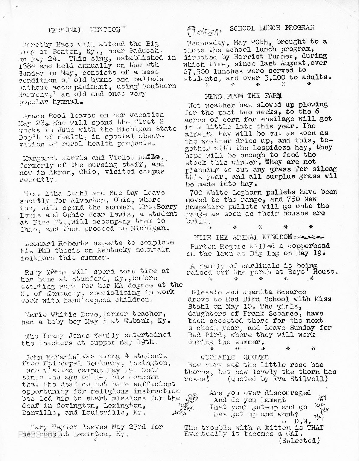002 PERSONAL MENTION: News about Dorothy Nace at the “Big Sing”; Grace Rood; Margaret Jarvis and Violet Radle, former PMSS nurses; Atha Stahl and Sue Day; Mrs. Berry Lewis and Ophie Jean Lewis; Leonard Roberts; Ruby Yokum; Marie Whitie Dove, former PMSS teacher; Dr. Tracy Jones family; John McDaniel, visitor.