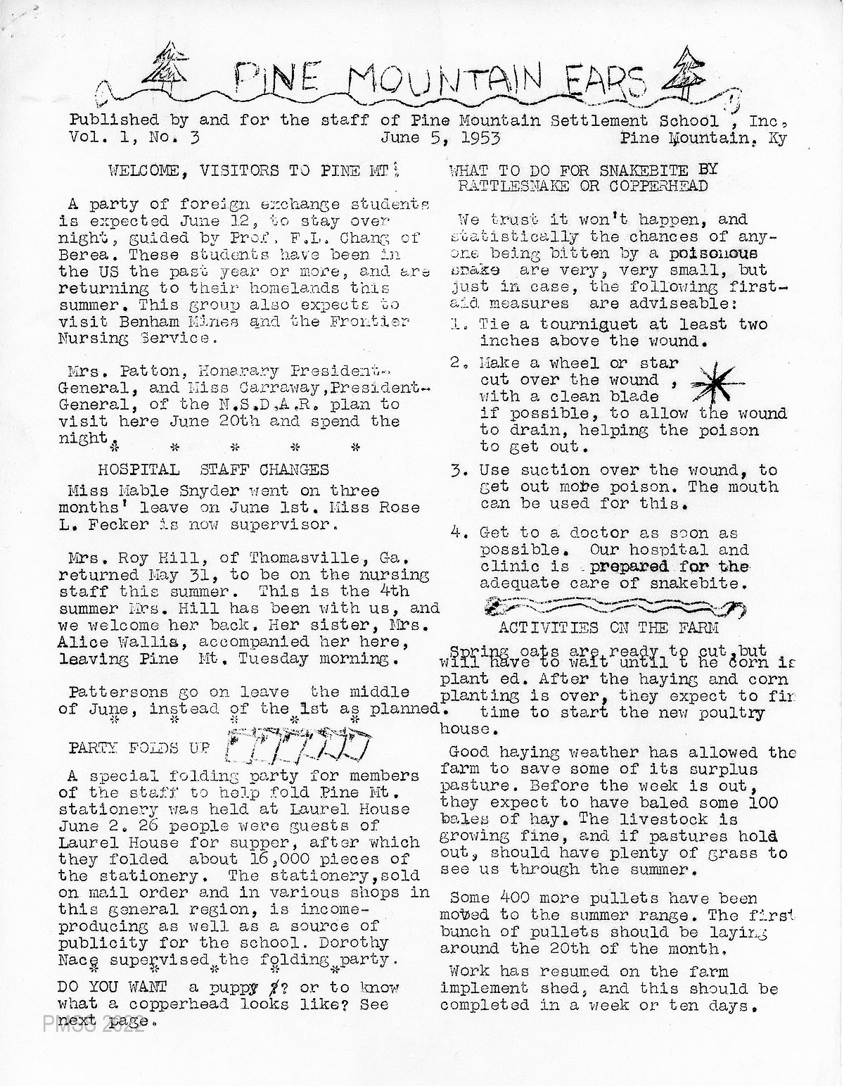 The Pine Mountain Settlement School informal staff newsletter, Pine Mountain Ears, was produced from 1949 until 1956 during the Community School years. It was edited by Dorothy Nace, a School staff member from 1949 until December 1952. Ellen [Gundersen] Wolfe served for several months as the Editor from May 8, 1953, until July 18, 1953.