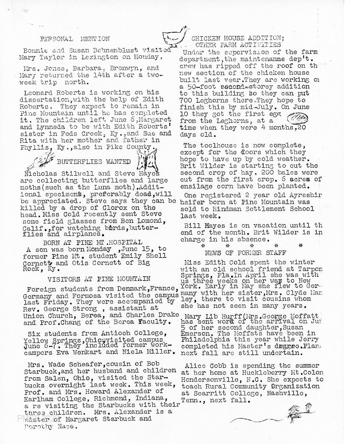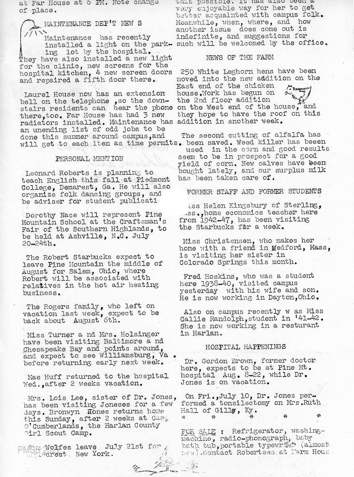 PERSONAL MENTION: News about Leonard Roberts; Dorothy Nace; Robert Starbuck and family will leave PMSS mid-August for Salem, OH; Rogers family; Miss Turner and Mrs. Holsinger; Mae Huff (hospital); Dr. Jones’ sister and Bronwyn Jones; the Wolfes.
