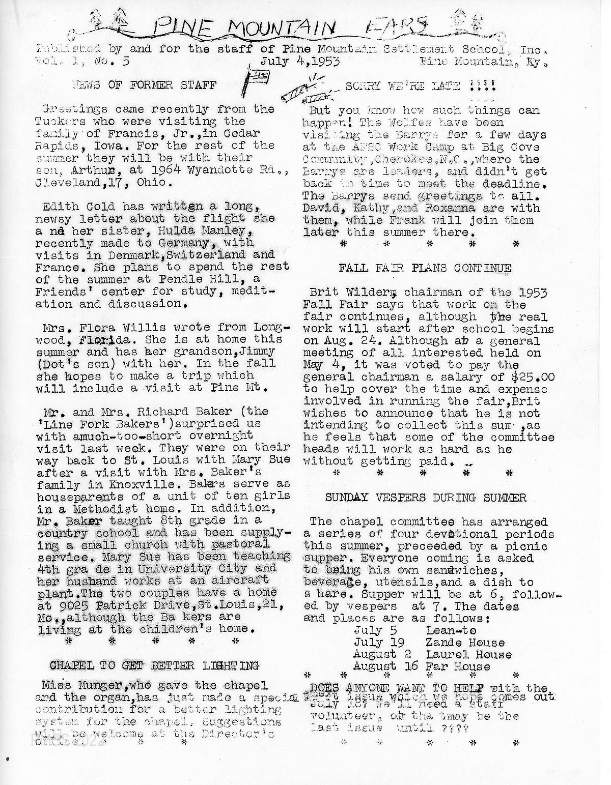 001 Vol. 1, No. 5. NEWS OF FORMER STAFF: The Tuckers; Edith Cold’s visit to Germany; Mrs. Flora Willis; Mr. and Mrs. Baker (the “Line Fork Bakers”) visit;.