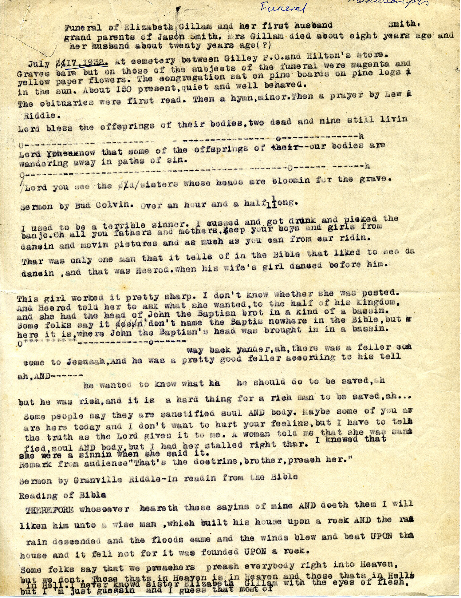 III. A MOUNTAIN FUNERALIZING, 1928. The third account is a 15-page transcription of A MOUNTAIN FUNERALIZING that appears to have been prepared for publication and is very detailed in its representation of the ritual service.