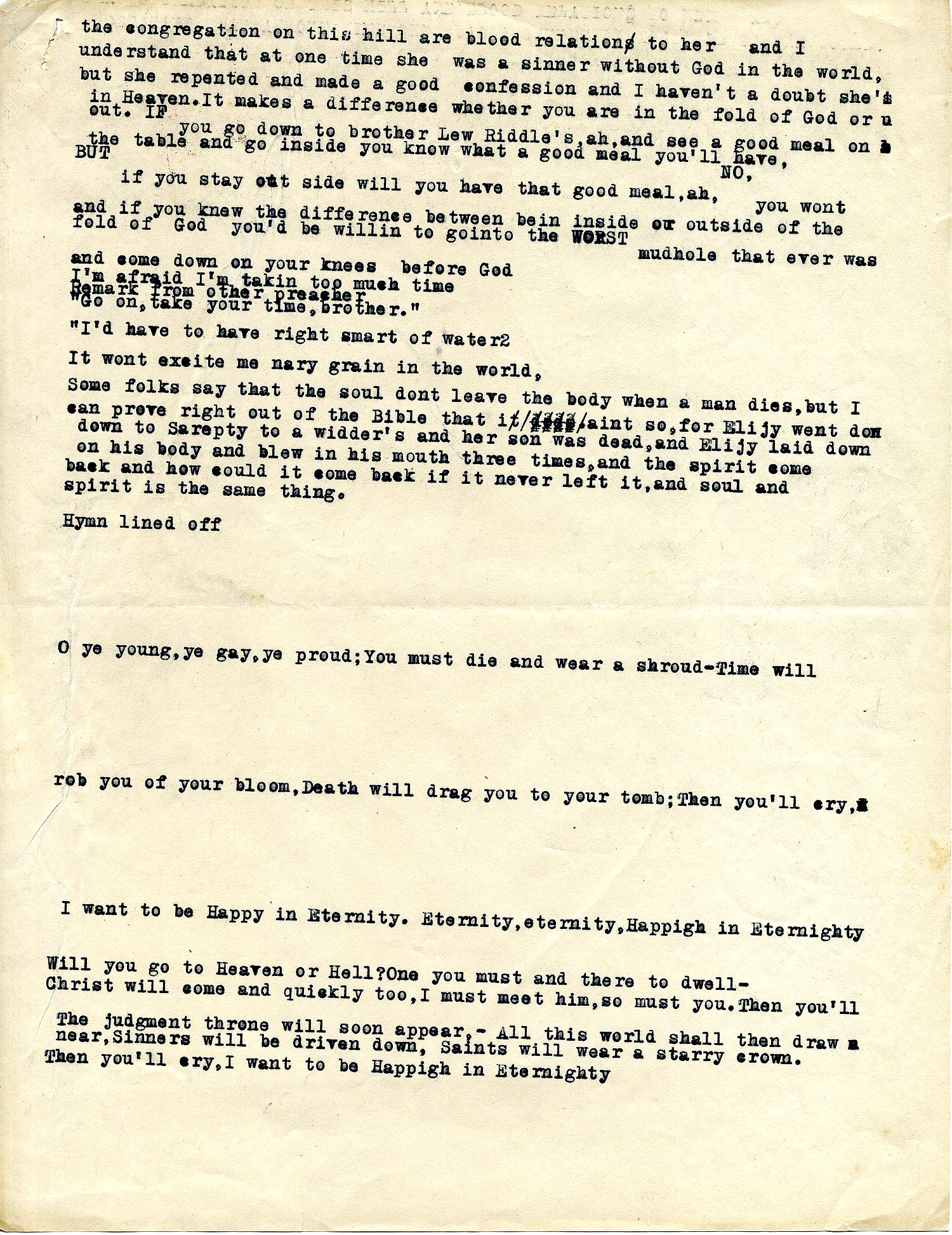 My very respectable friends, it’s a mighty sad occasion that has brought us together this mornin’. I want you to go aprayin’ that there will be something said or done today that will mean the savin’ of some soul before they die. If your soul has been purified by the blood of the Lord Jesus Christ, you’re saved. Death has brought us here this mornin’. Now don’t forget this mornin, everyone of you to pray. …. Some begged me not to come here today. (4.)