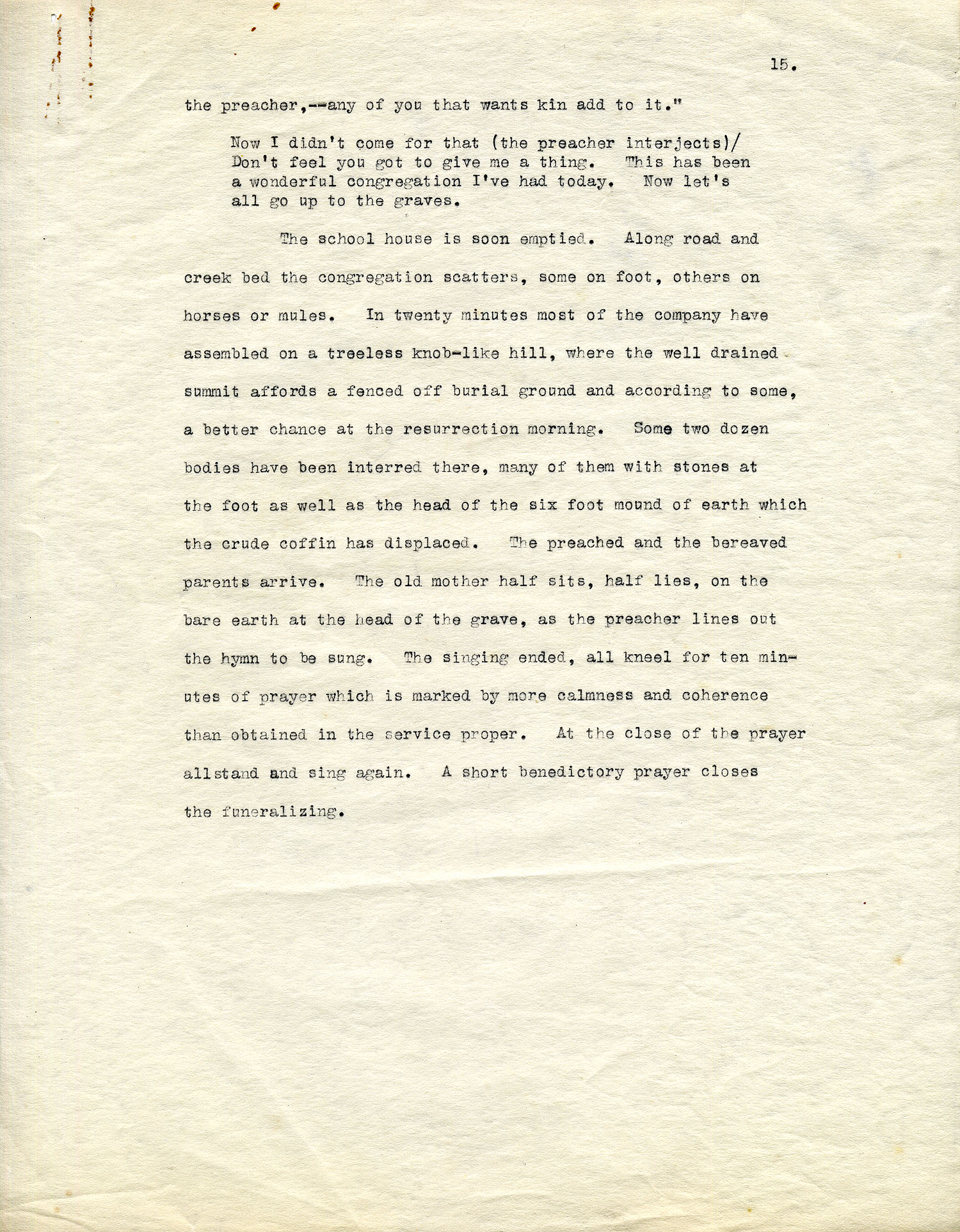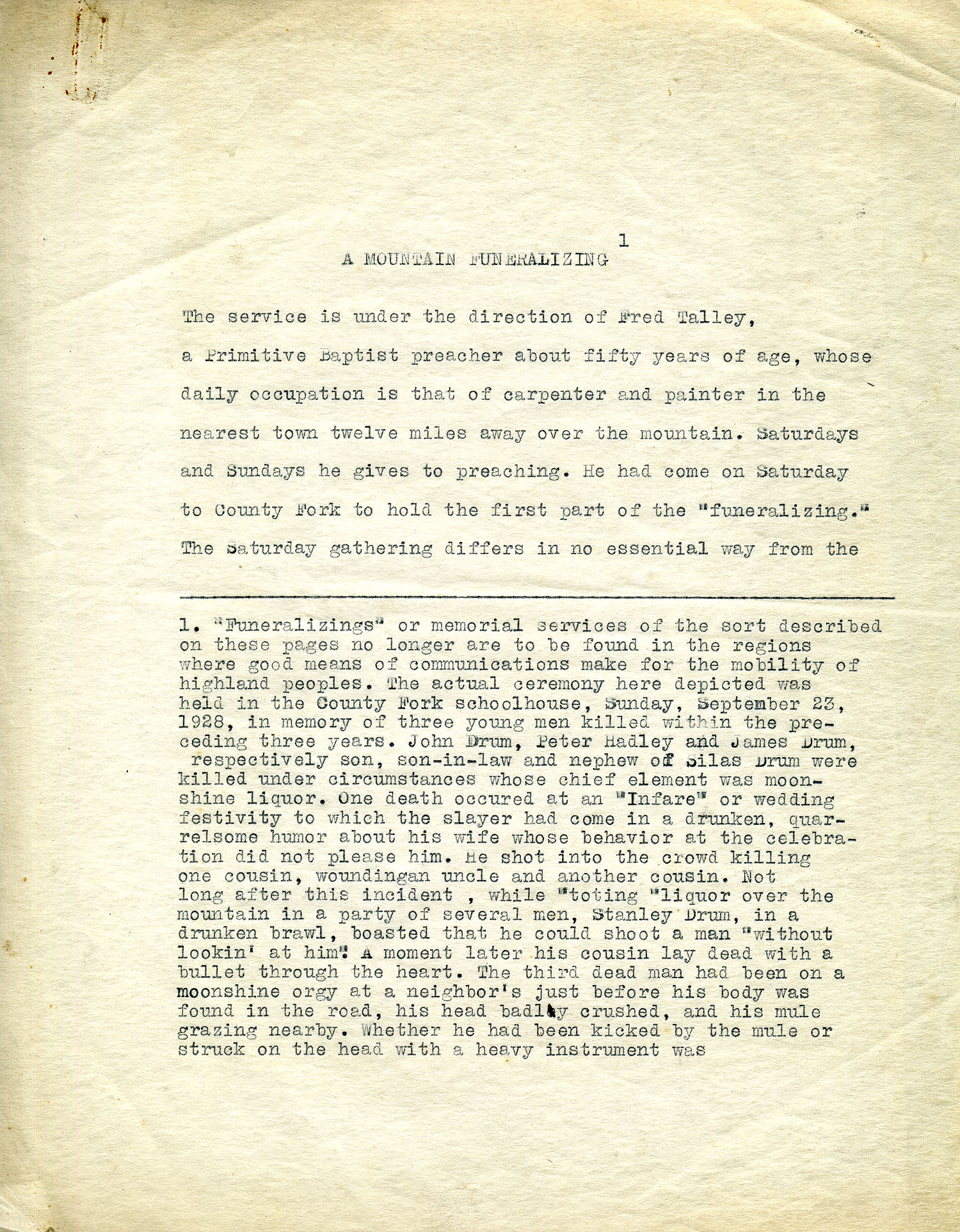 II. THE FUNERAL, c. 1930s. The second ‘funeralizing’ account, THE FUNERAL, is by two Pine Mountain workers who were sent to a community funeralizing on Greasy Creek to represent the School and to gather information on the ritual. One is identified in the account.