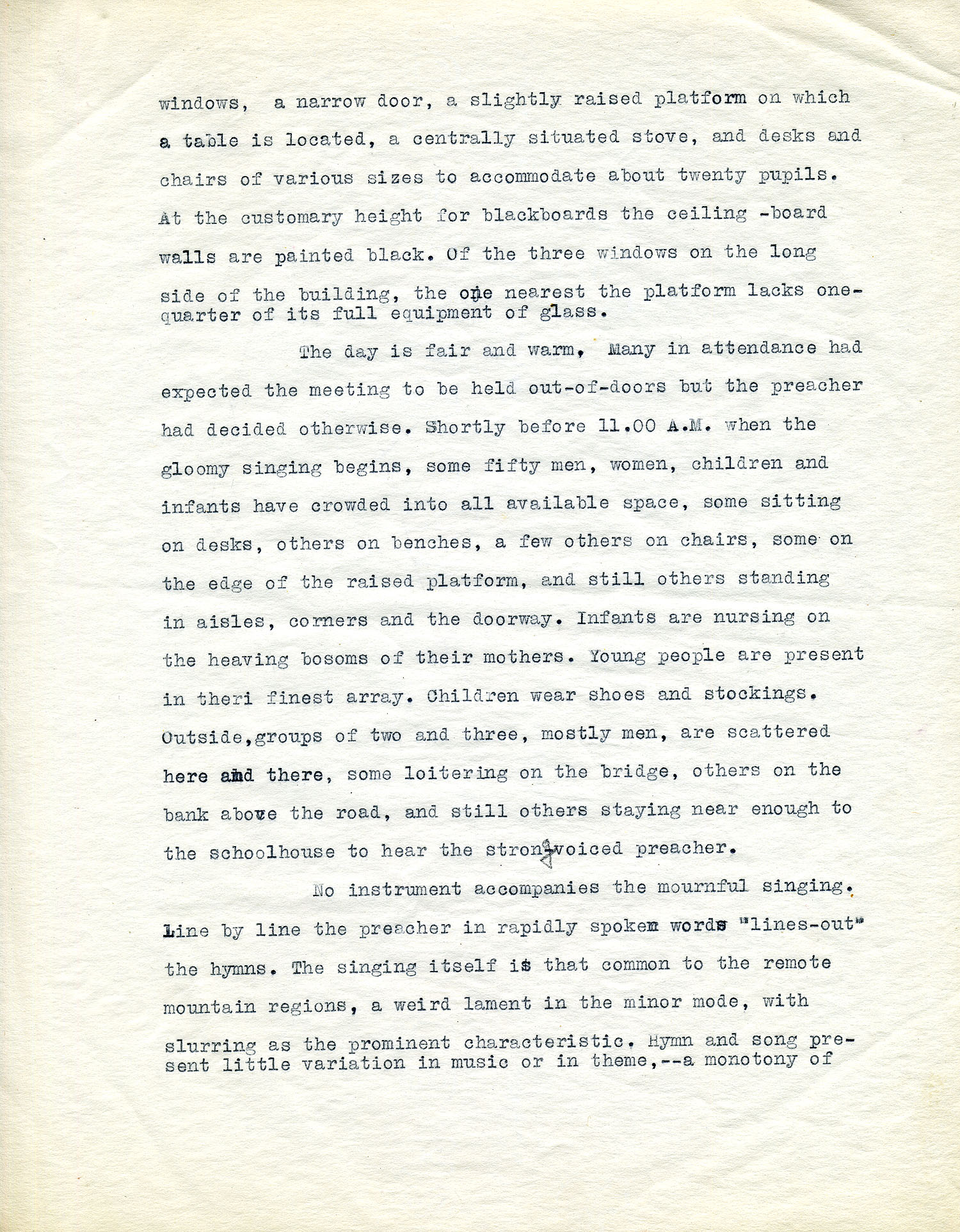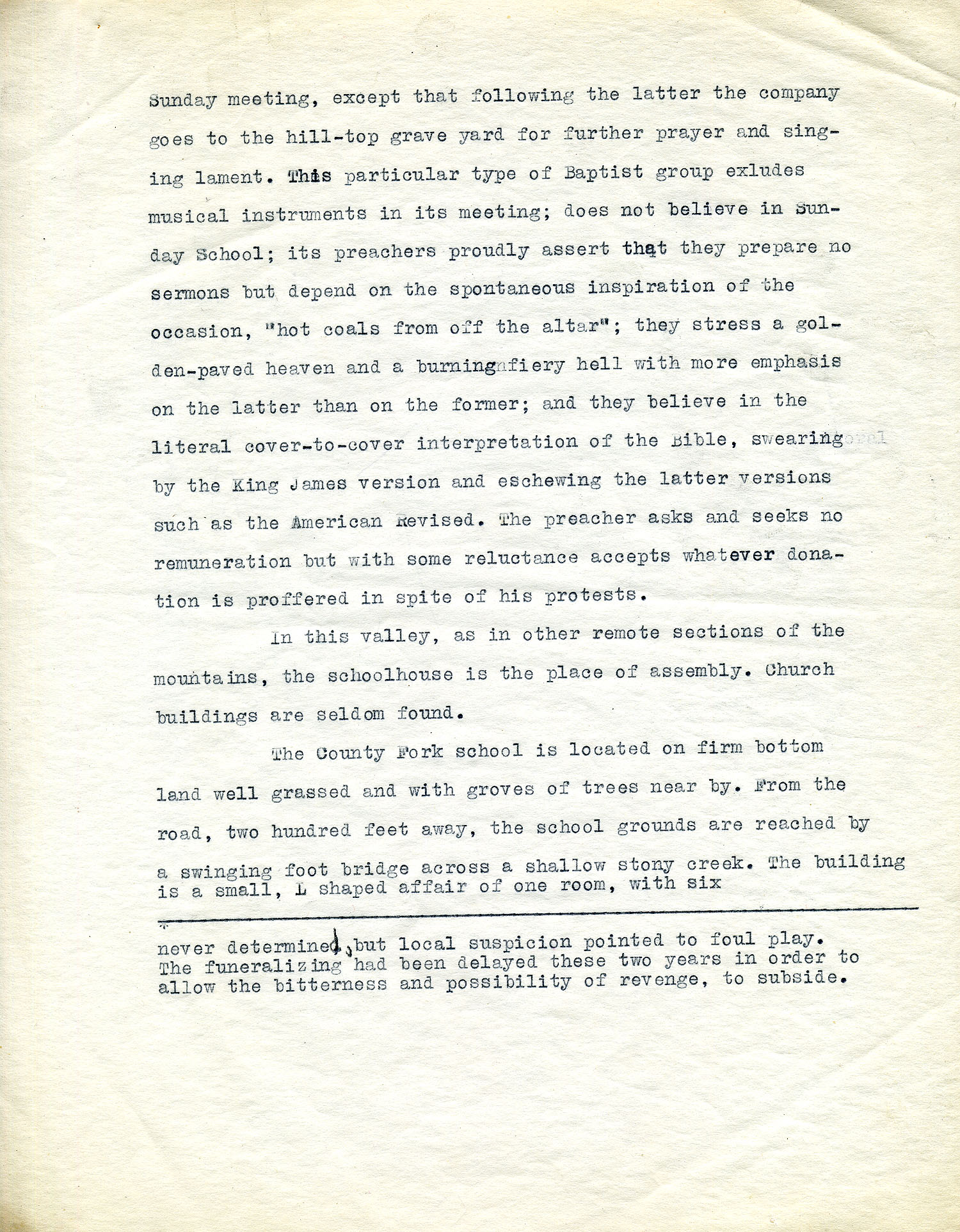 The service is under the direction of Fred Talley, Primitive Baptist preacher about fifty years of age, whose daily occupation is that of carpenter and painter in the nearest town twelve miles away over the mountain. Saturdays and Sundays he gives to preaching. He had come on Saturday to County Fork to hold the first part of the ‘funeralizing’. (1.) The Saturday gathering differs in no essential way from the [page 002] Sunday meeting, except that following the latter the company goes to the hill-top grave yard for further prayer and sing­ing lament. This particular type of Baptist group excludes musical instruments in its meeting; does not believe in Sun­day School; its preachers proudly assert that they prepare no sermons “but depend on the spontaneous inspiration of the occasion, hot coals from off the altar”; they stress a gol­den-paved heaven and a “burning fiery hell” with more emphasis on the latter than on the former; and they “believe in the literal cover-to-cover interpretation of the Bible, swearing by the King James version and eschewing the latter versions such as the American revised. The preacher asks and seeks no remuneration “but with some reluctance accepts whatever dona­tion is proffered” in spite of his protests.