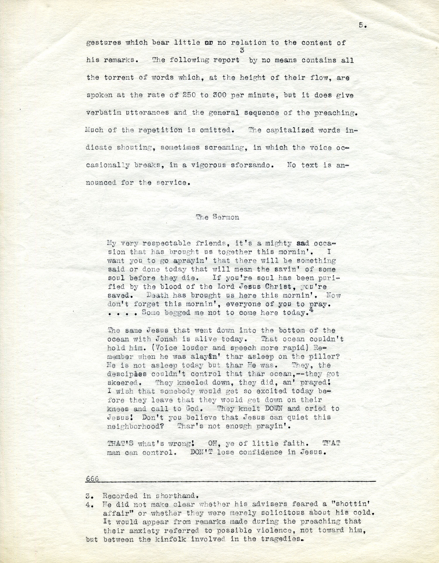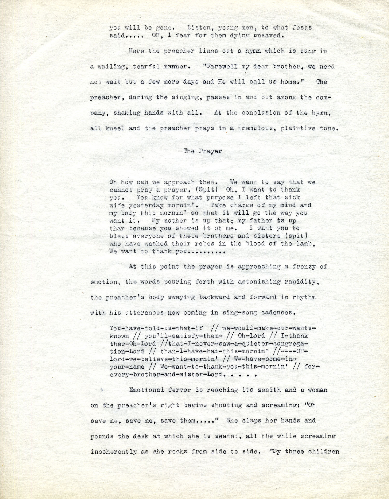 The preacher, having satisfied himself that his audience is in a tolerably comfortable and receptive mood, sets forth on his discourse, beginning in what may be termed a normal delivery, both as to voice and gesture. His speech accelerates as he proceeds. The sermon is marked by superfluous repetition, by emphases, loud shouted exclamations, and [page 005] gestures which bear little or no relation to the content of his remarks. The following report (3.) by no means contains all the torrent of words which, at the height of their flow, are spoken at the rate of 250 to 300 per minute, but it does give verbatim utterances and the general sequence of the preaching. Much of the repetition is omitted. The capitalized words indicate shouting, sometimes screaming, in which the voice occasionally breaks, in a vigorous sforzando. No text is announced for the service.
