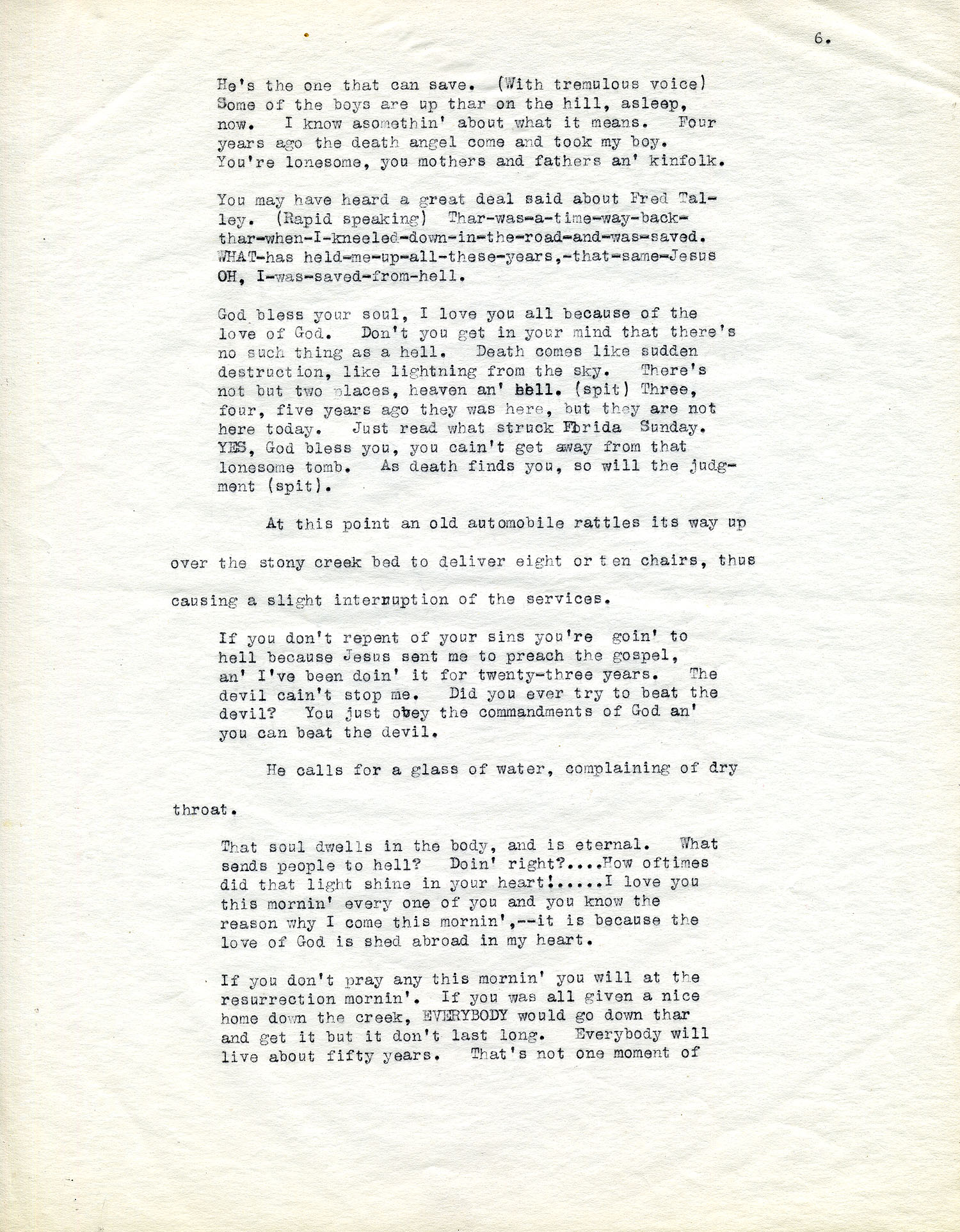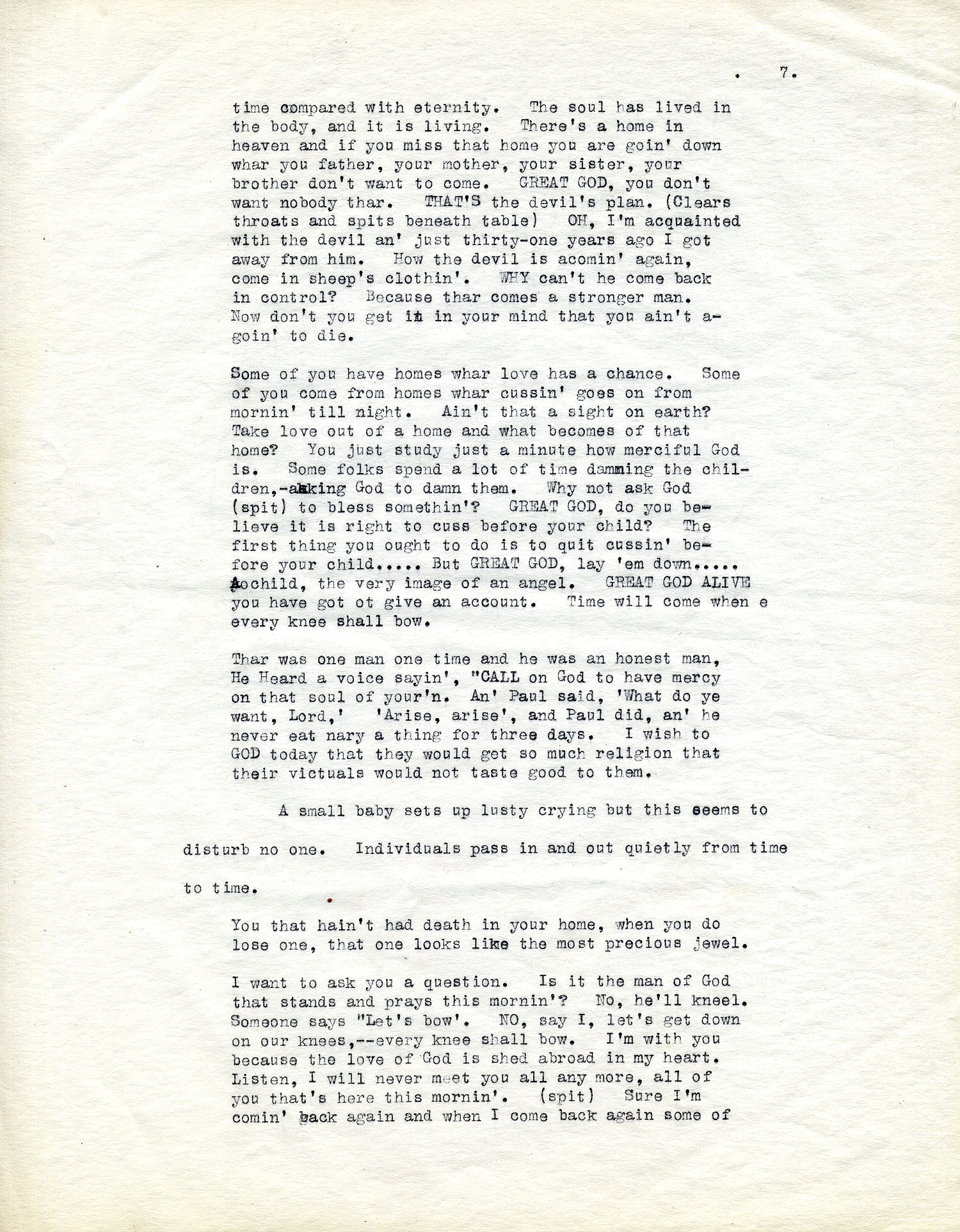 If you don’t pray any this mornin’ you will at the resurrection mornin’. If you was all given a nice home down the creek, EVERYBODY would go down thar and get it but it don’t last long. Everybody will live about fifty years. That’s not one moment of time compared with eternity. The soul has lived in the body, and it is living. There’s a home in heaven and if you miss that home you are goin’ down whar your father, your mother, your sister, your brother don’t want to come. GREAT GOD, you don’t want nobody thar. THAT’S the devil’s plan. (Clears throats and spits beneath table) OH, I’m acquainted with the devil an’ just thirty-one years ago I got away from him. How the devil is acomin’ again, come in sheep’s clothin’. WHY can’t he come back in control? Because thar comes a stronger man. Now don’t you get it in your mind that you ain’t a-goin’ to die.