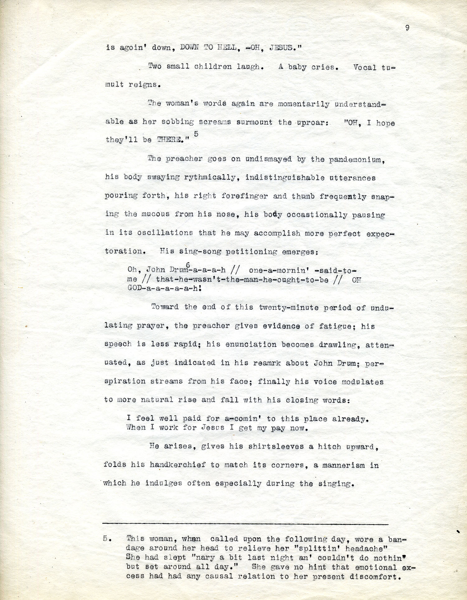 Emotional fervor is reaching its zenith and a woman on the preacher’s right begins shouting and screaming: “Oh save me, save me, save them…..” She claps her hands and pounds the desk at which she is seated, all the while screaming incoherently as she rocks from side to side. “My three children [page 009] is agoin’ down, DOWN TO HELL, OH, JESUS.”