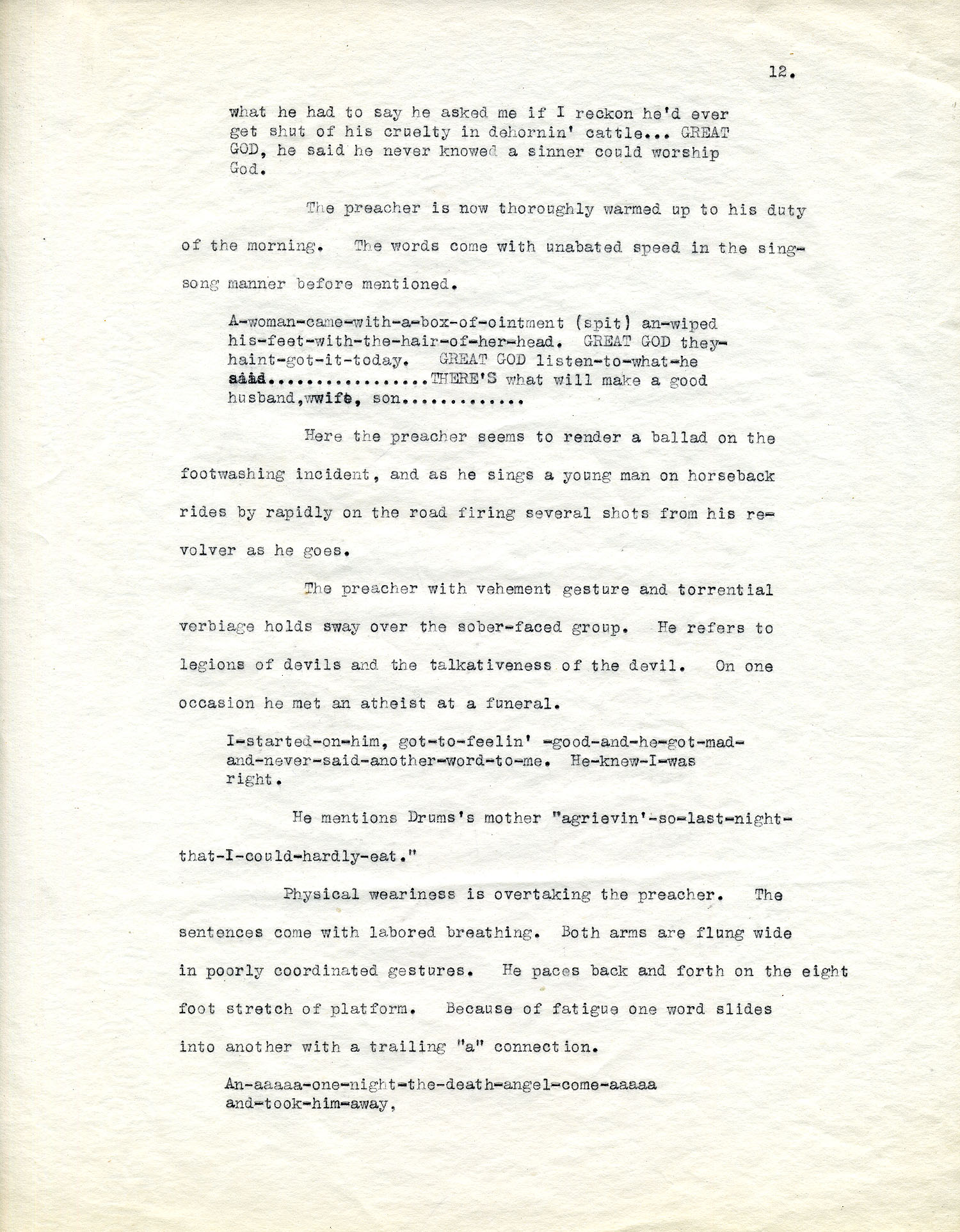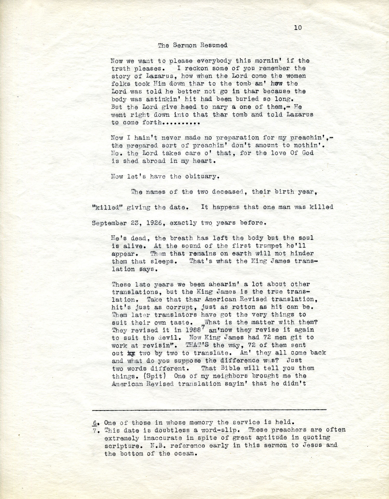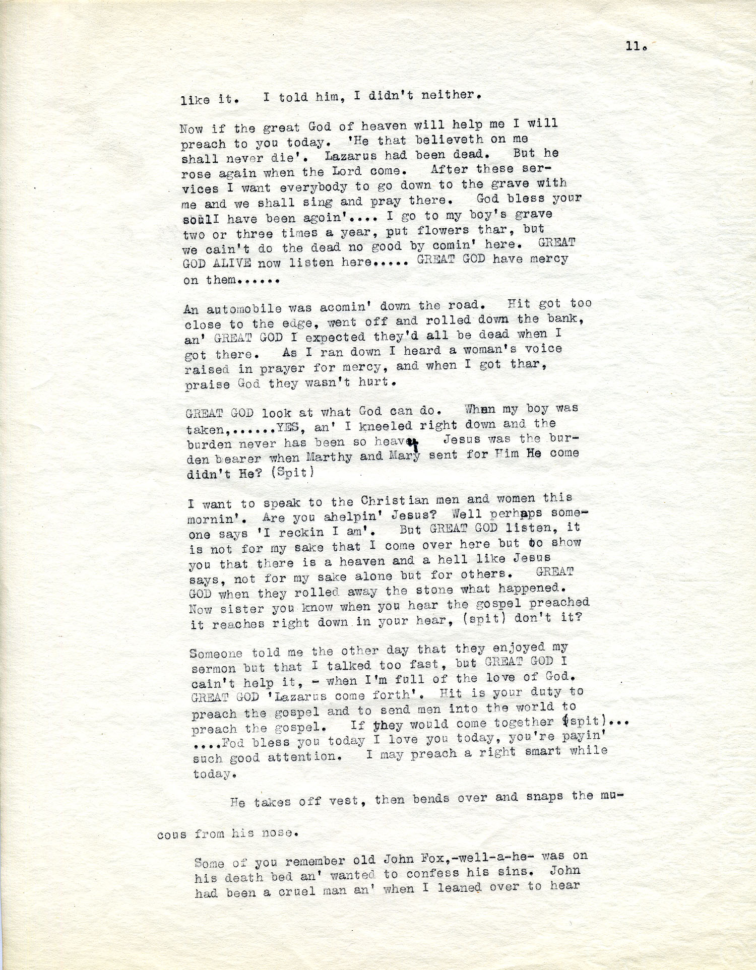 occasion he met an atheist at a funeral. “I-started-on-him, got-to-feelin’ -good-and-he-got-mad-and-never-said-another-word-to-me. He-knew-I-was right.” He mentions Drum’s mother “agrievin’-so-last-night-that-I-could-hardly-eat.”