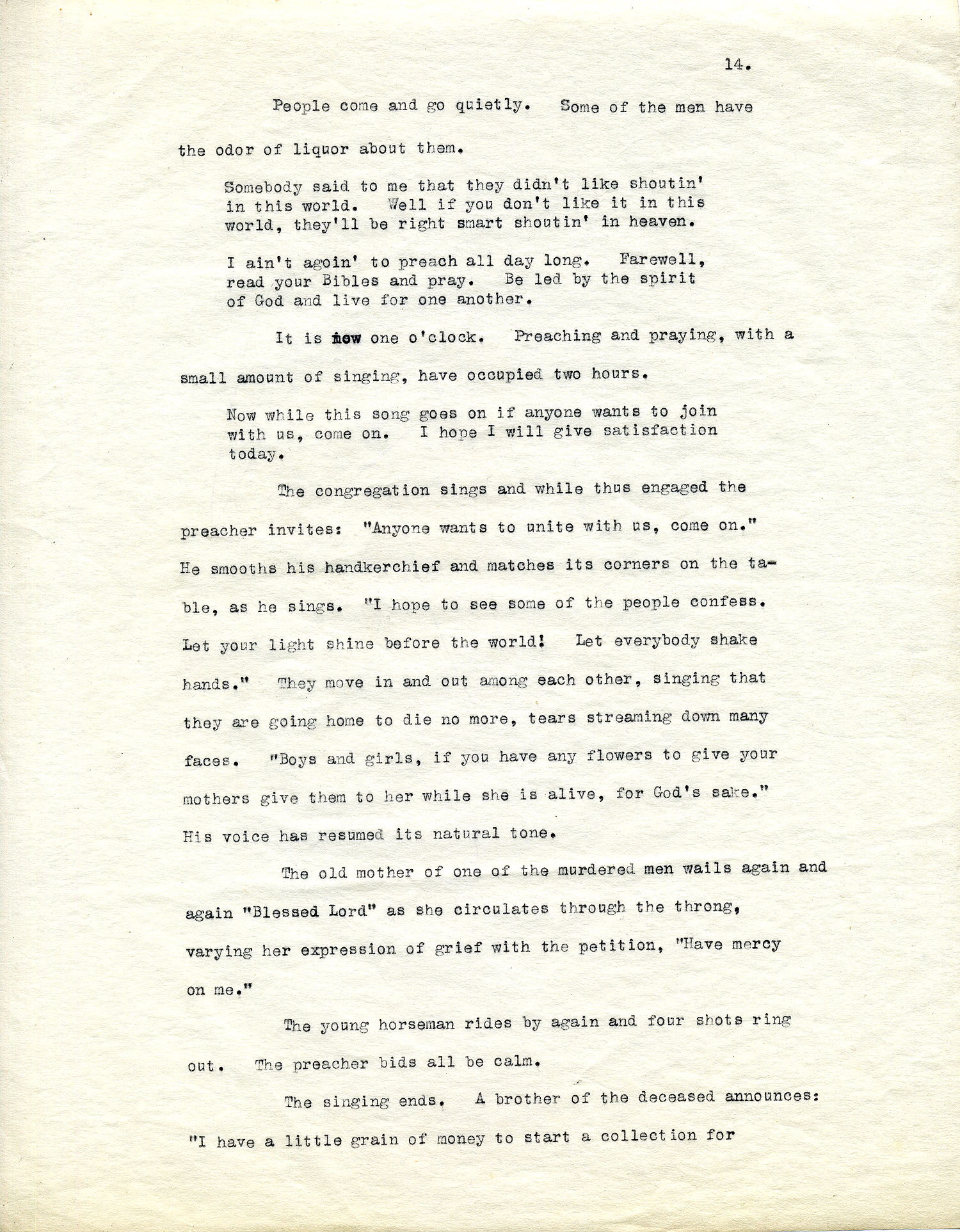 The singing ends. A brother of the deceased announces: “I have a little grain of money to start a collection for [page 015] the preacher,—any of you that wants kin add to it.”