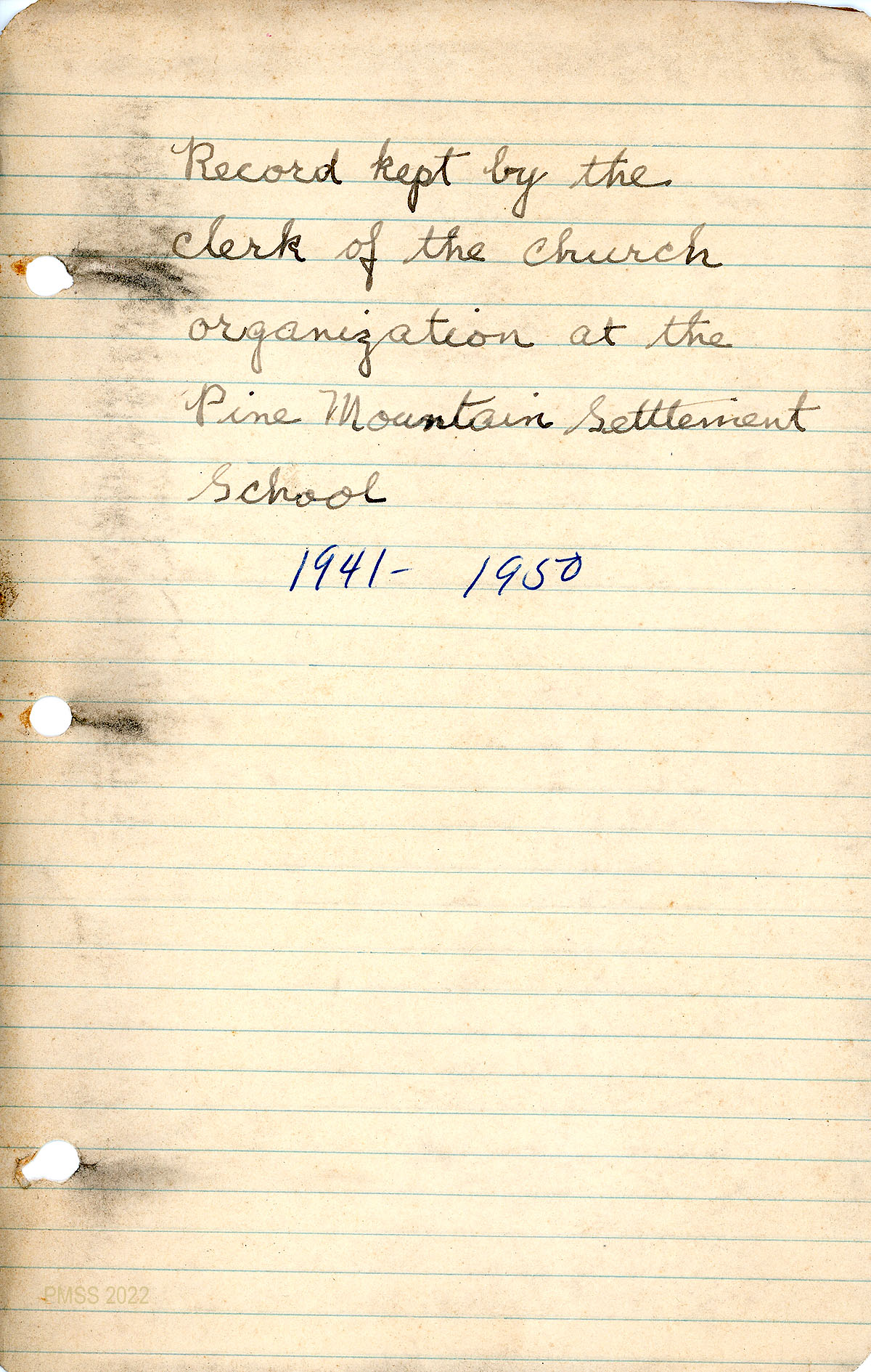 001 Cover page. “Record kept by the clerk of the church organization at the Pine Mountain Settlement School.” [Notation in a different hand: “1941-1950”],