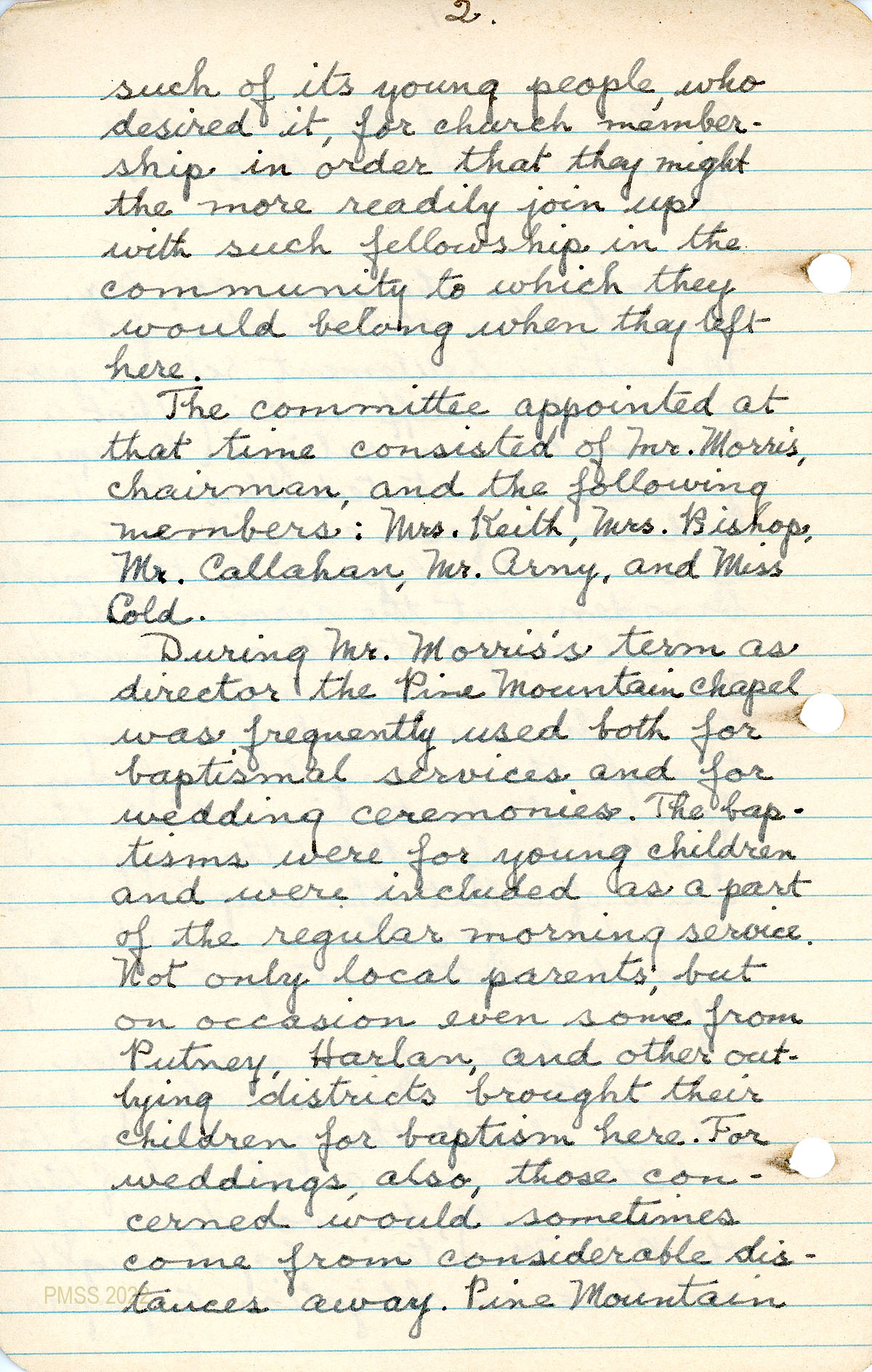 When letters from graduates came to Mr. Morris asking for advice about the question as to whether to join a church of their community, he wondered if the Pine Mountain chapel might not have an obligation to prepare such of its young people, who desired it for church membership in order that they might the more readily join up with such fellowship in the community to which they would belong when they left here.
