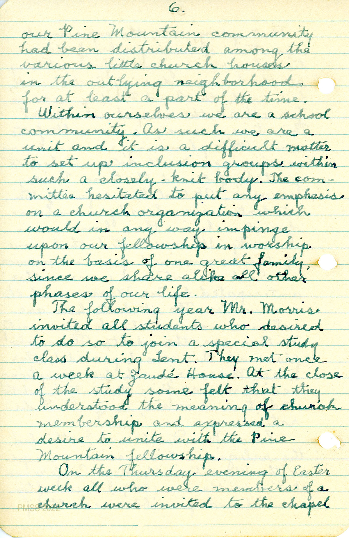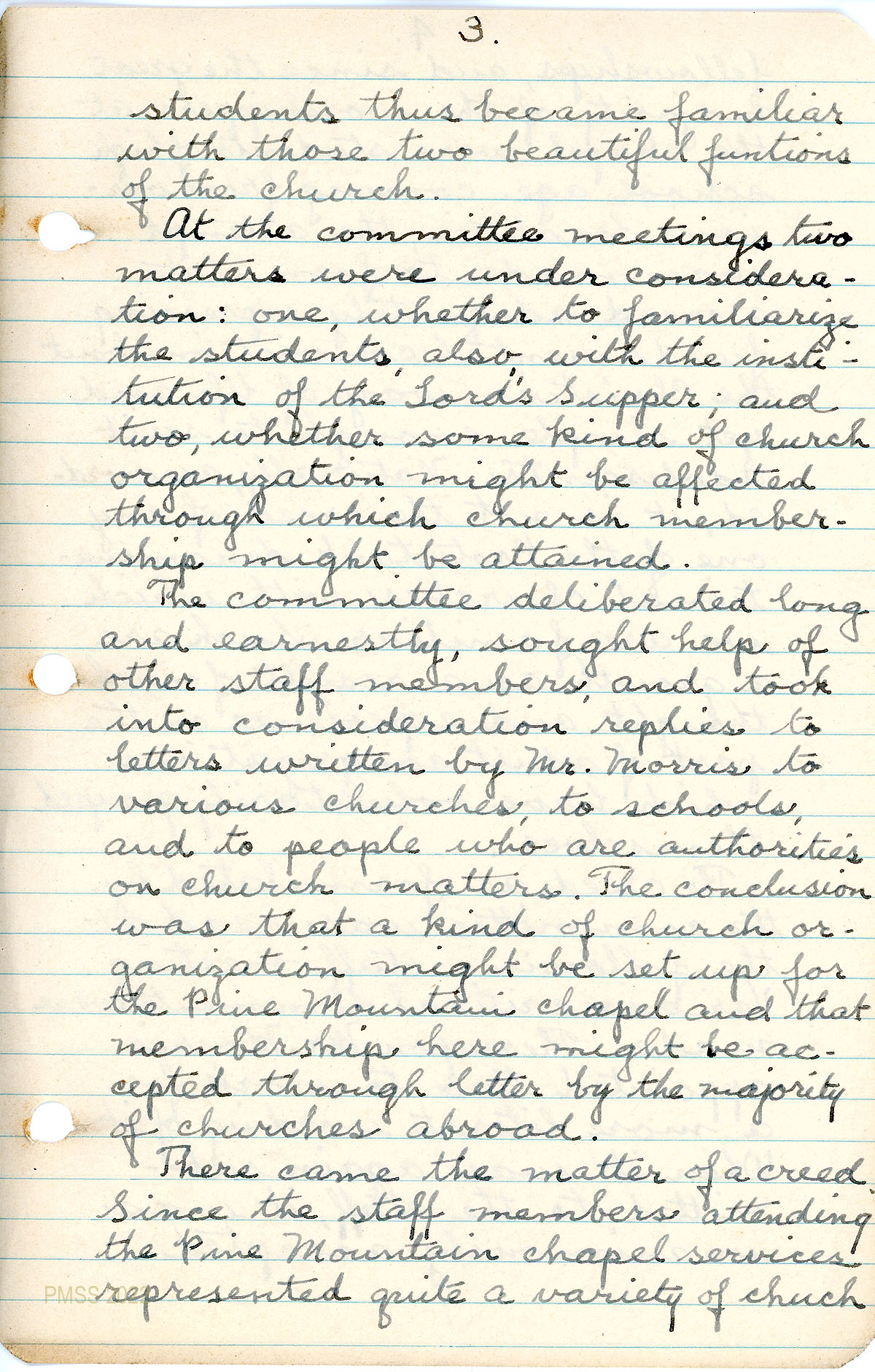 The Committee deliberated long and earnestly, sought help of other staff members, and took into consideration replies to letters written by Mr. Morris to various churches, to schools, and to people who are authorities on church matters. The conclusion was that a kind of church organization might be set up for the Pine Mountain Chapel and that membership here might be accepted through letter by the majority of churches abroad.