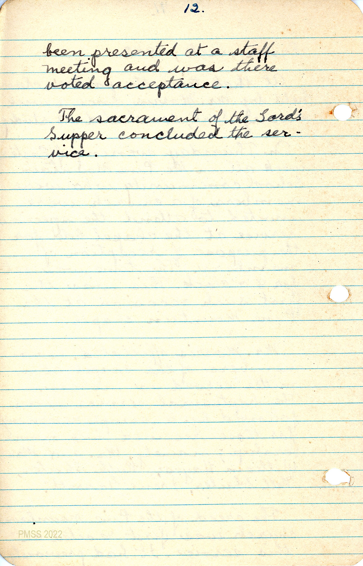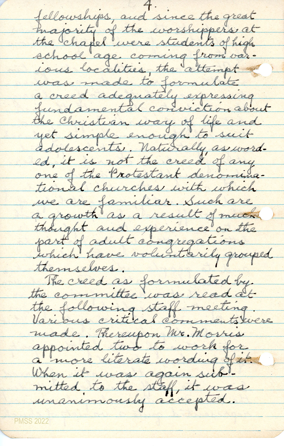 The Creed as formulated by the Committee was read at the following staff meeting. Various critical comments were made. Thereupon Mr. Morris appointed two to work for a more iterate wording of it. When it was again submitted to the staff, it was unanimously accepted.