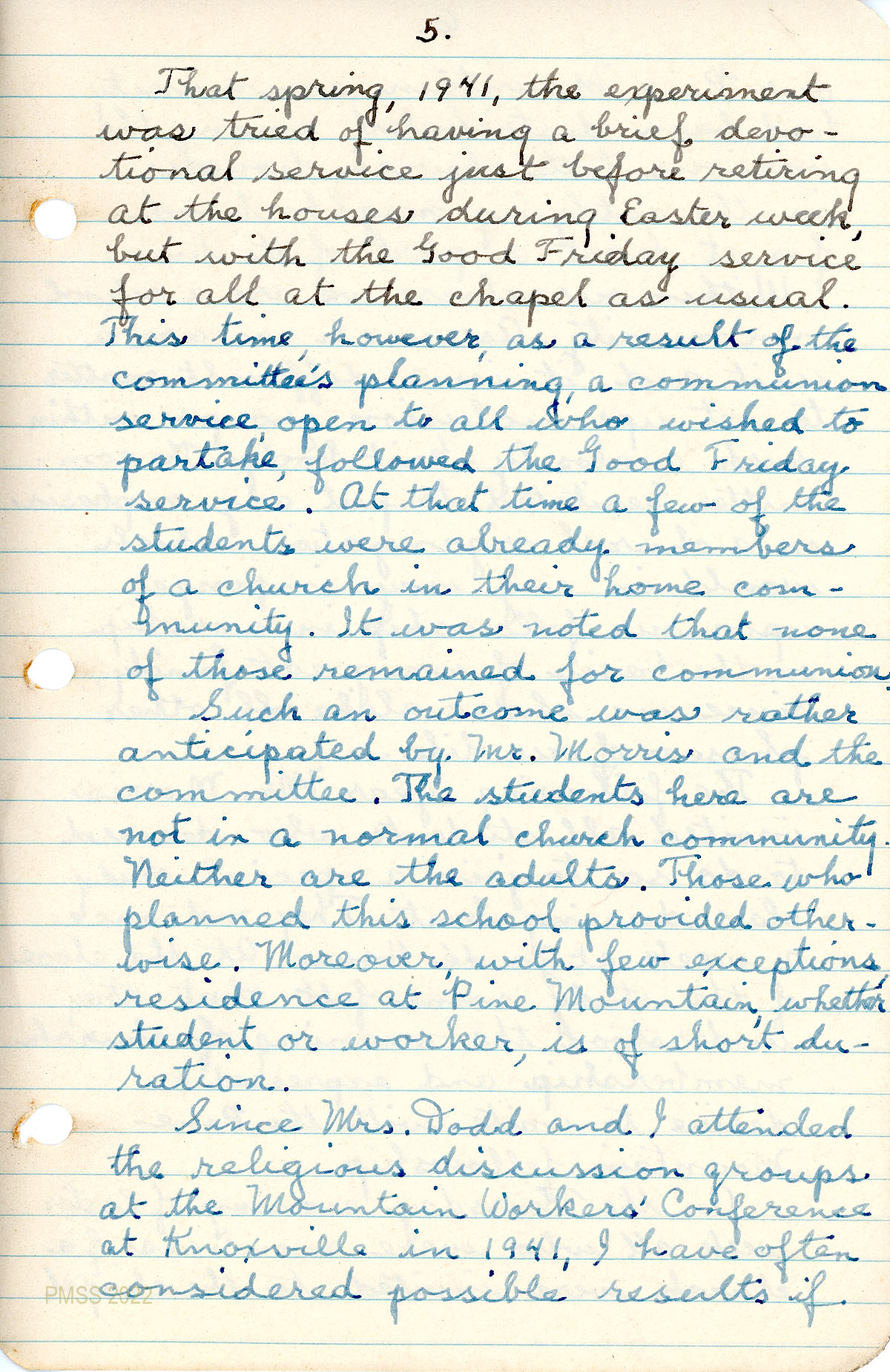 Early in the year, 1941, Mr. Morris, then director of the Pine Mountain Settlement School, proposed at a staff meeting that a committee on religion be appointed. He stated that the time had come for a consideration of some developments that might broaden out the service of the school chapel to its community. Mr. Morris was influenced to make such a beginning through the many letters from former students in which they particularly stated their appreciation of what the chapel services had done for them as aid toward a better interpretation of life.