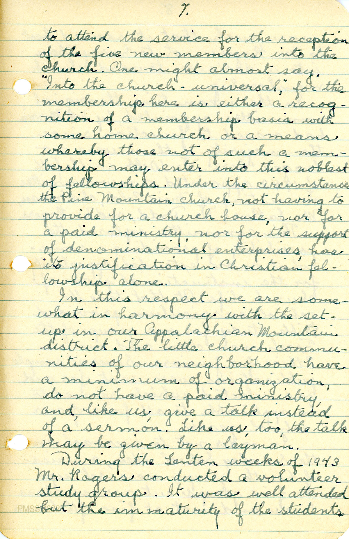 Edith Cold describes the Church as the idea of Glyn Morris who came to Pine Mountain [as Director] in 1931. Her narrative, titled “A Résumé of the Activities of Church Committees, 1941-1944.” details the process: