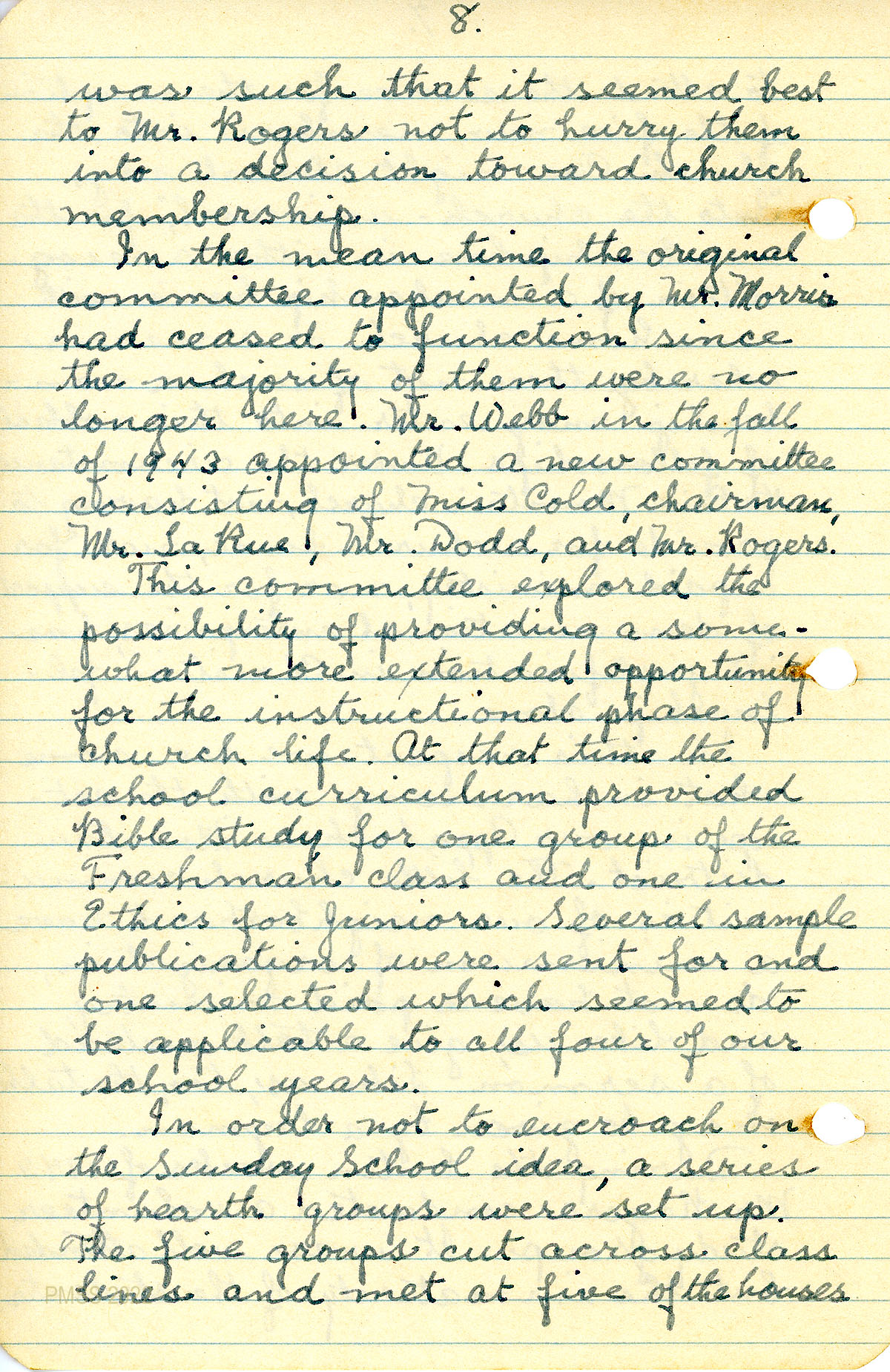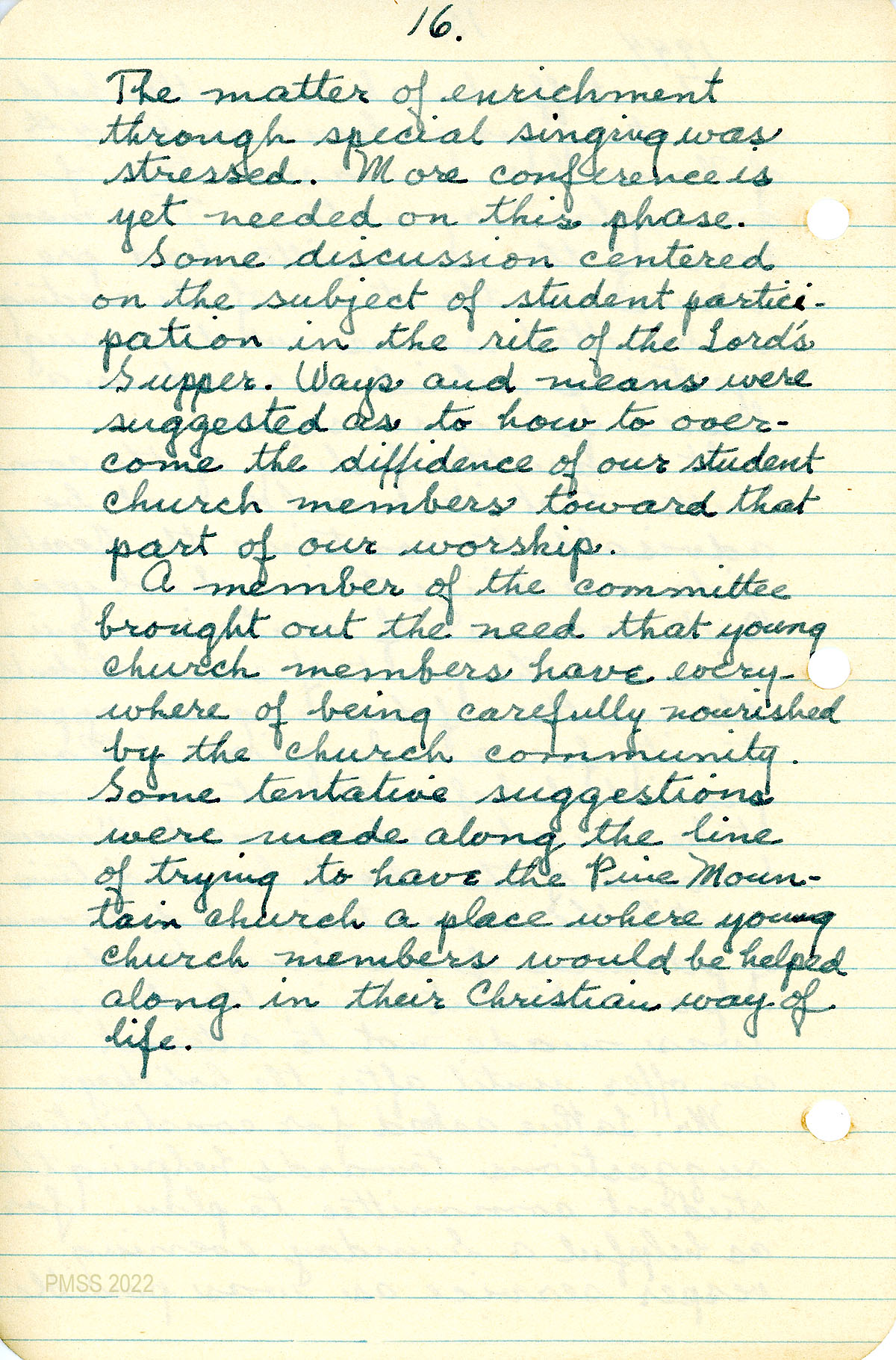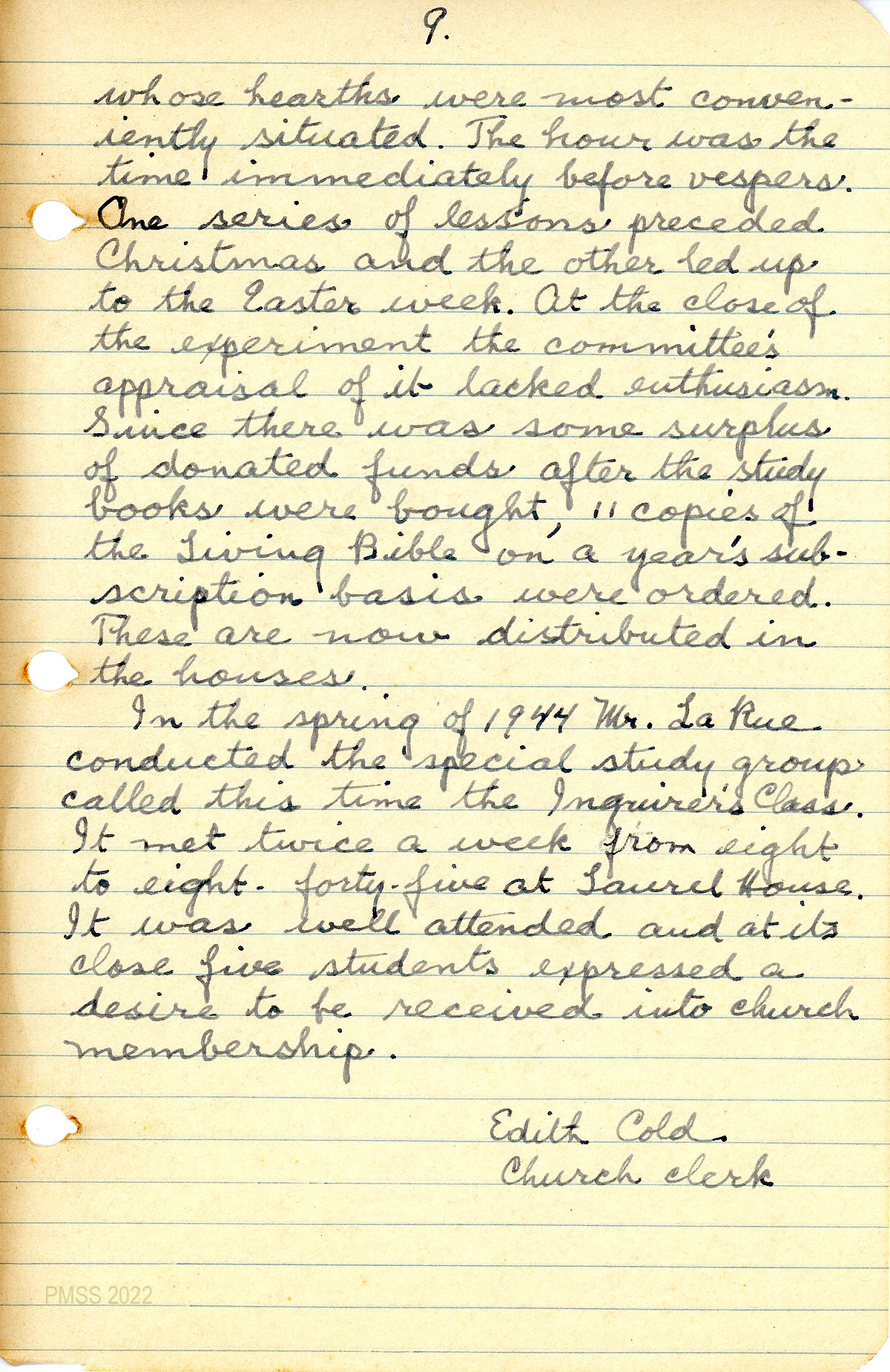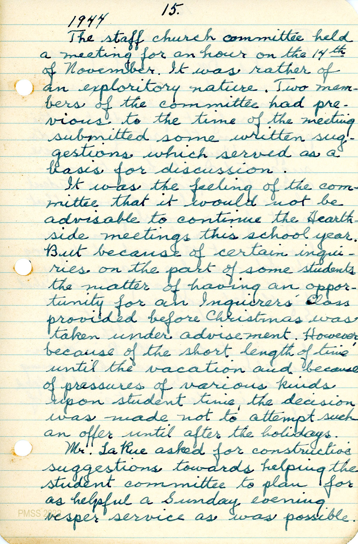 015-016 1944. One-hour staff church committee held on November 14 to discuss suggestions submitted by two members. The committee decided to discontinue the Hearthside meetings; Inquirers’ Class postponed until after Christmas vacation. LaRue asked for suggestions for the student committee plans for a Sunday vesper service. Also discussed: special singing, student participation in the rite of the Lord’s Supper; how to help young church members.