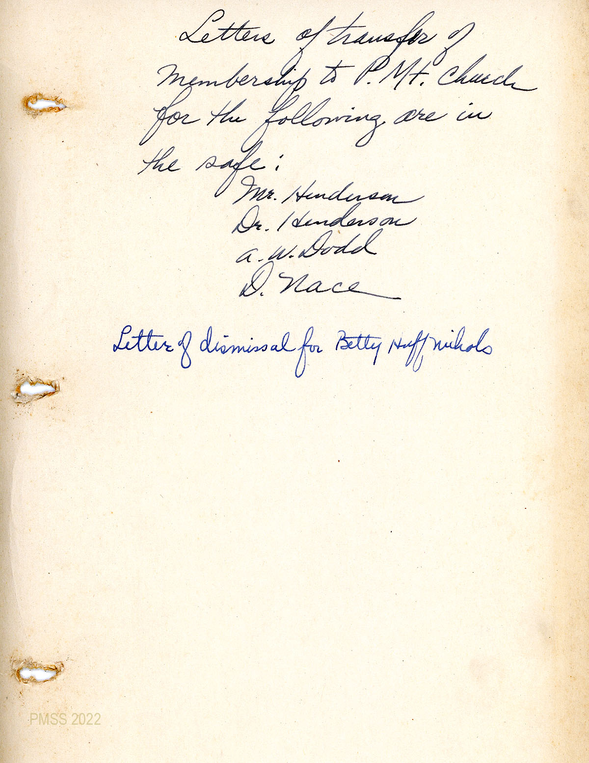 010 [No Date] Memo. “Letters of transfer of membership to P. Mt. Church for the following are in the safe: Mr. Henderson, Dr. [Elizabeth] Henderson, [Arthur] W. Dodd, [Dorothy] Nace.” [Notation in a different hand: “Letter of dismissal for Betty Huff Nichols.”]