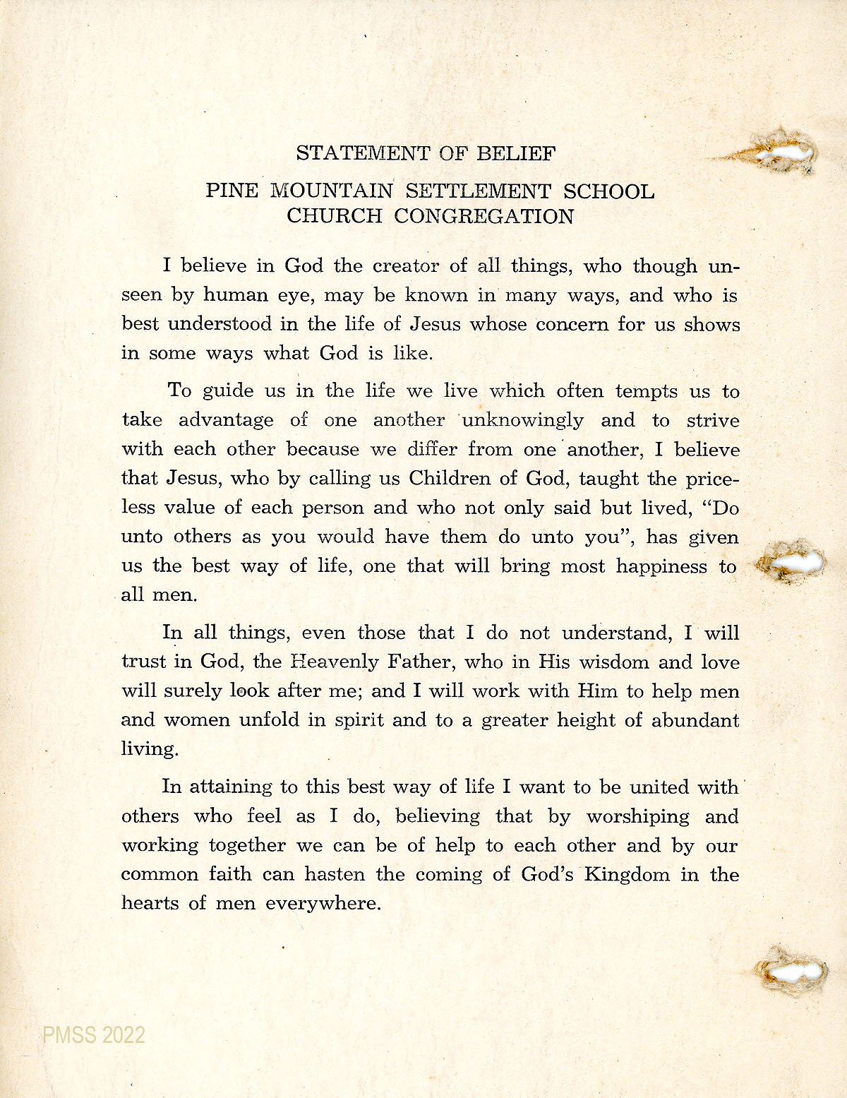 012 [No Date] Published tract. “STATEMENT OF BELIEF, PINE MOUNTAIN SETTLEMENT SCHOOL, CHURCH CONGREGATION”