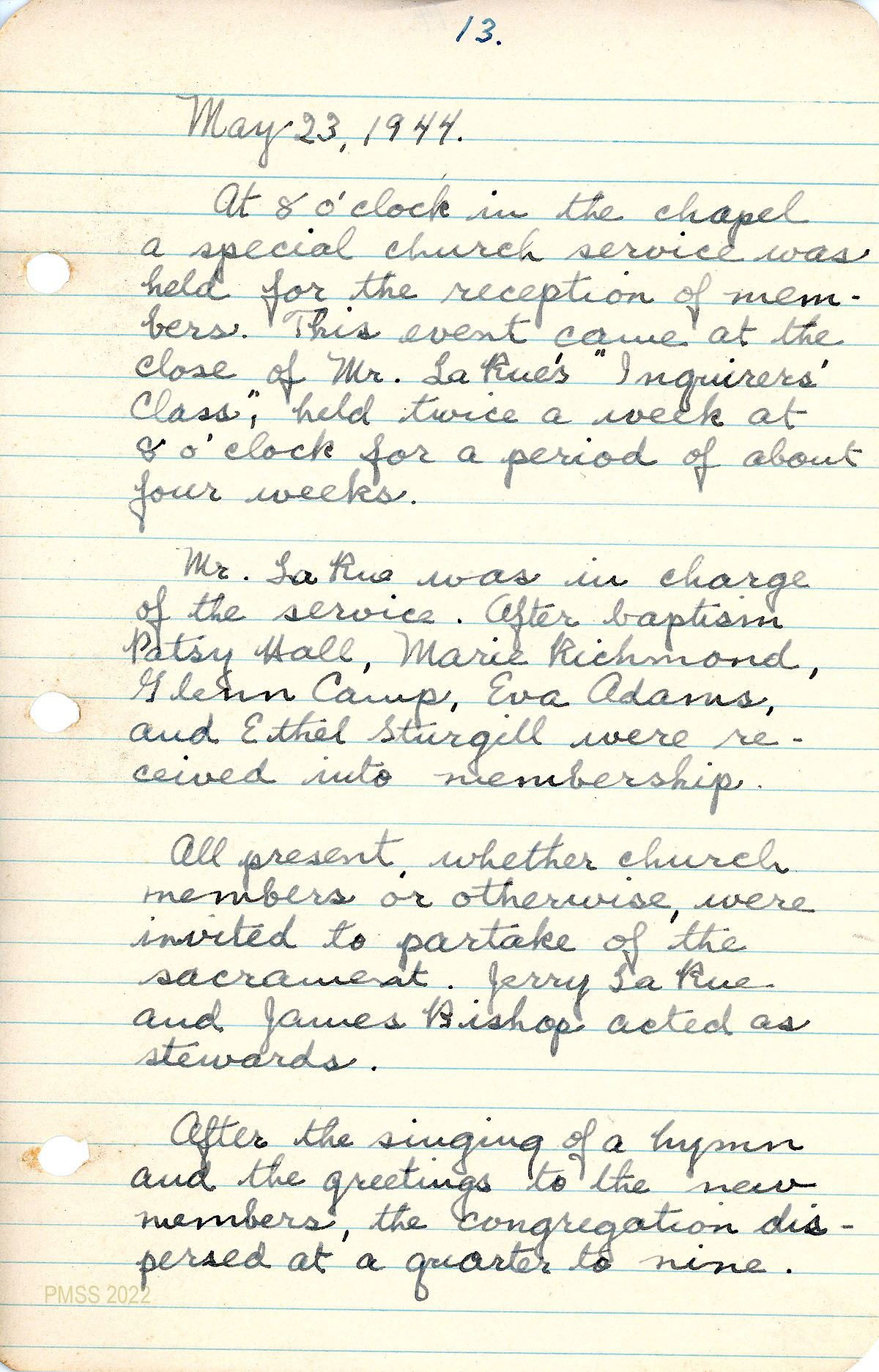 013 May 23, 1944. Special church service held in Chapel for new members, following Mr. Glenn LaRue’s “Inquirers’ Class” of four weeks.” LaRue was in charge of the service. Patsy Hall, Marie Richmond, Glenn Camp, Eva Adams, and Ethel Sturgill were received into membership.” Jerry LaRue and James Bishop were stewards of the sacrament.