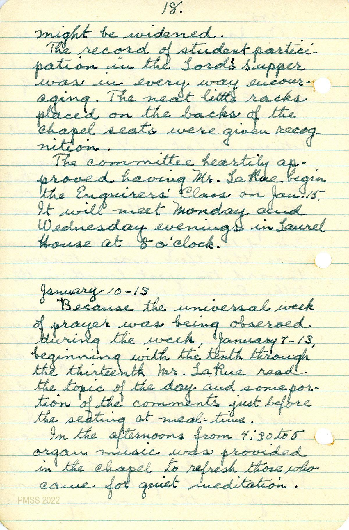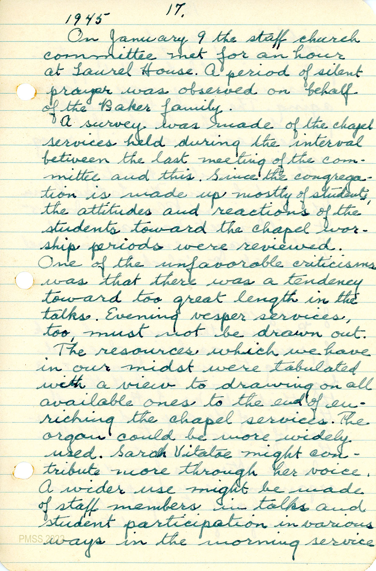 017-019 1945. The Staff church committee met for one hour at Laurel House; a silent prayer was observed for the Baker family. A survey of students’ attitudes toward the Chapel worship periods was reviewed. Suggested improvements: a wider use of the organ, Sarah Vitatoe’s voice, staff members in talks, and student participation. Mention of students’ increased participation in the Lord’s Supper; small racks on the Chapel seat backs; Mr. LaRue’s Enquirers’ Class to restart in January.