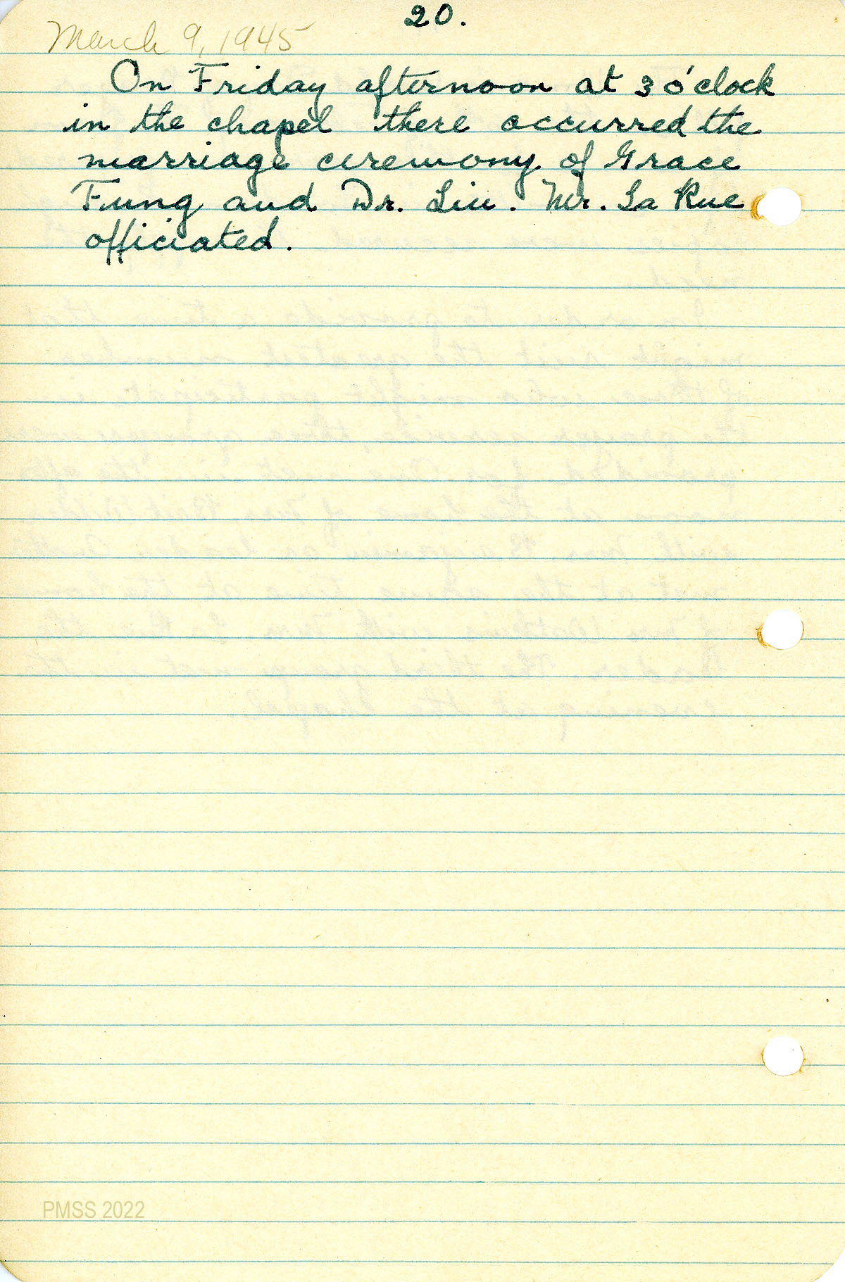 020 [Penciled notation in top margin: “March 9, 1945.”] Marriage ceremony in Chapel for Grace Feng and Dr. Liu; LaRue officiated.
