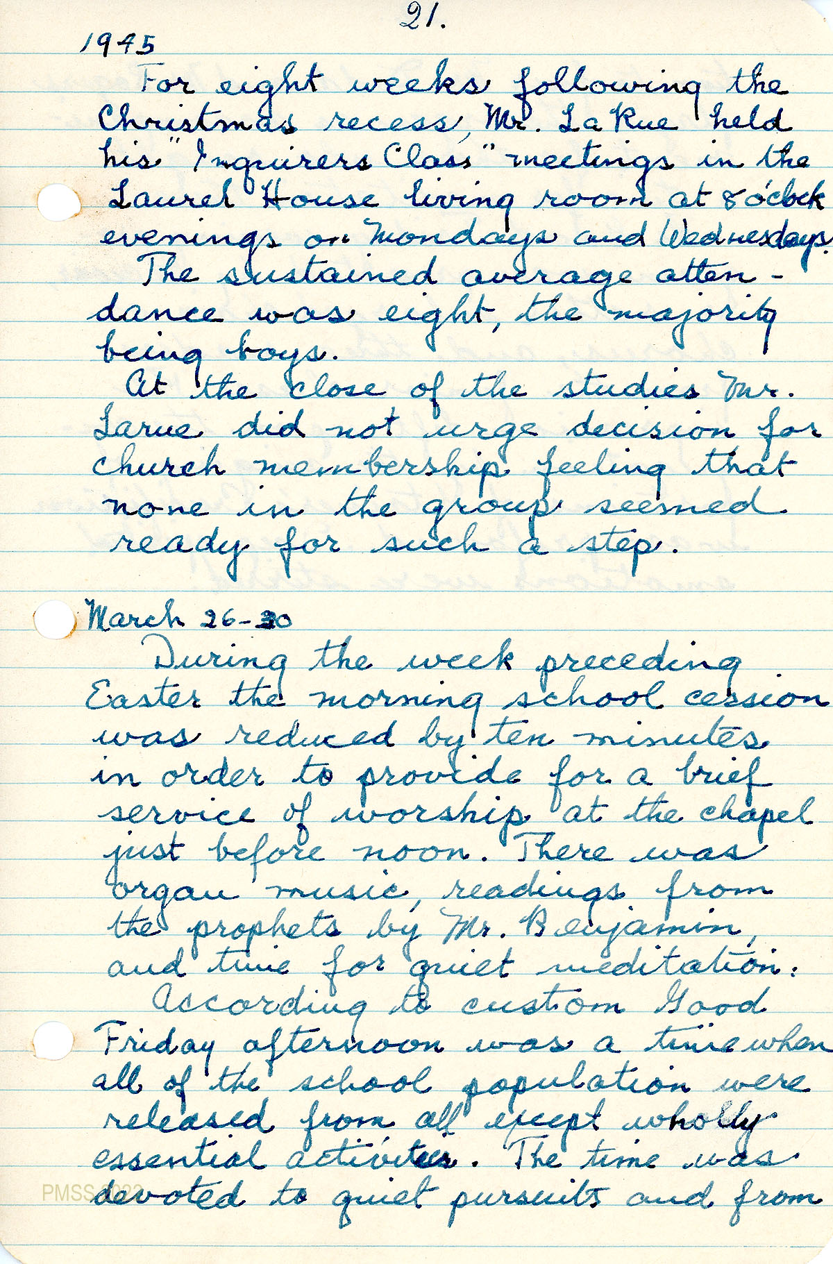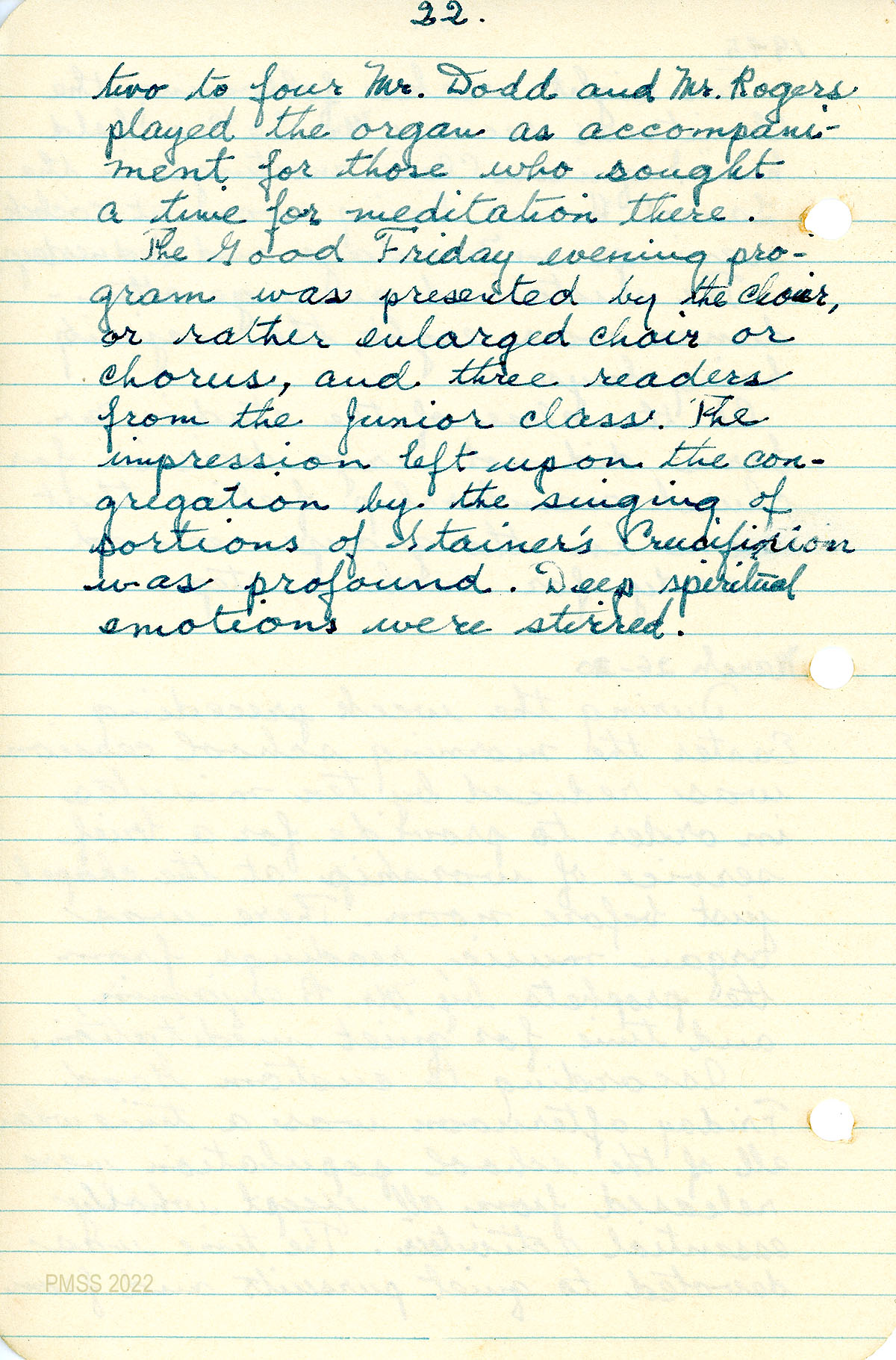 March 26 -30. During the week before Easter, the school session was shortened by ten minutes to provide for worship at the Chapel. The School was released from all activities on Good Friday afternoon; organ playing by Mr. Dodd and Mr. [Burton] Rogers; evening program involved the choir.