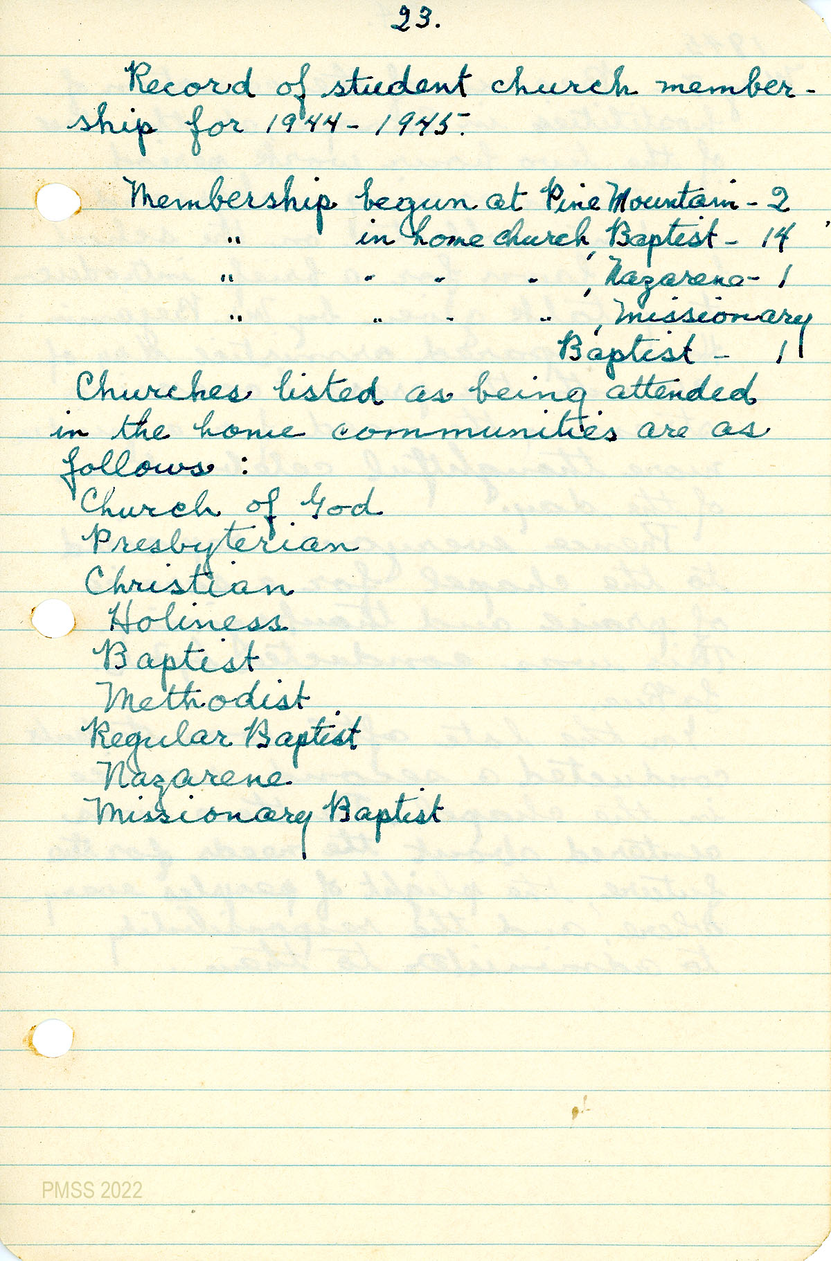 023 Record of student church membership for 1944-1945, listing number of members begun at PMSS and at home churches; list of churches in home communities (Church of God, Presbyterian, Christian, Holiness, Baptist, Methodist, Regular Baptist, Nazarene, Missionary Baptist.)