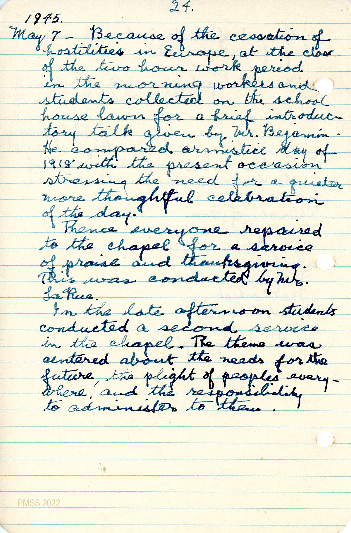 024 May 7, 1945. Observance of “cessation of hostilities in Europe” by students on the school house lawn with a brief talk by Mr. [H.R.S.] Benjamin, followed by a Chapel service by La Rue and a second one later.