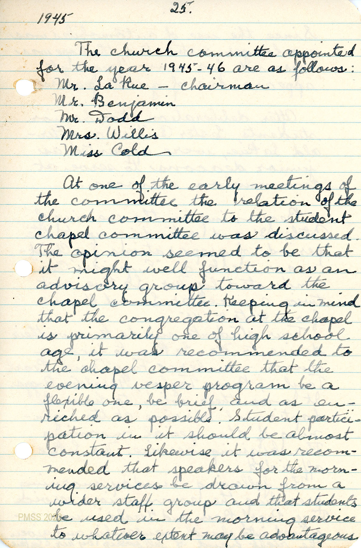 025 1945. Church committee members for 1945-46: La Rue, Benjamin, Dodd, Mr. Willis, Miss Cold. Discussion of interaction between the church committee and the student Chapel committee.