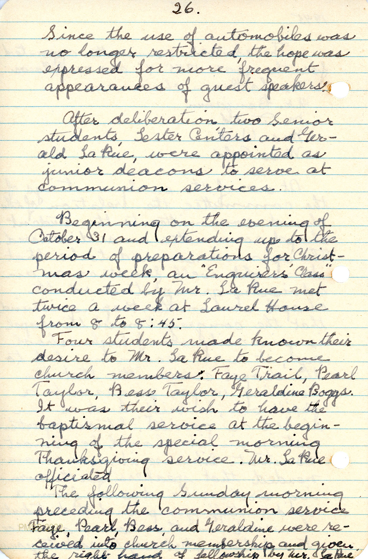 026 “…two senior students, Lester Centers and Gerald LaRue, were appointed junior deacons to serve at communion services.” Four students received baptisms and received into church membership: Faye Trail, Pearl Taylor, Bess Taylor, Geraldine Boggs.