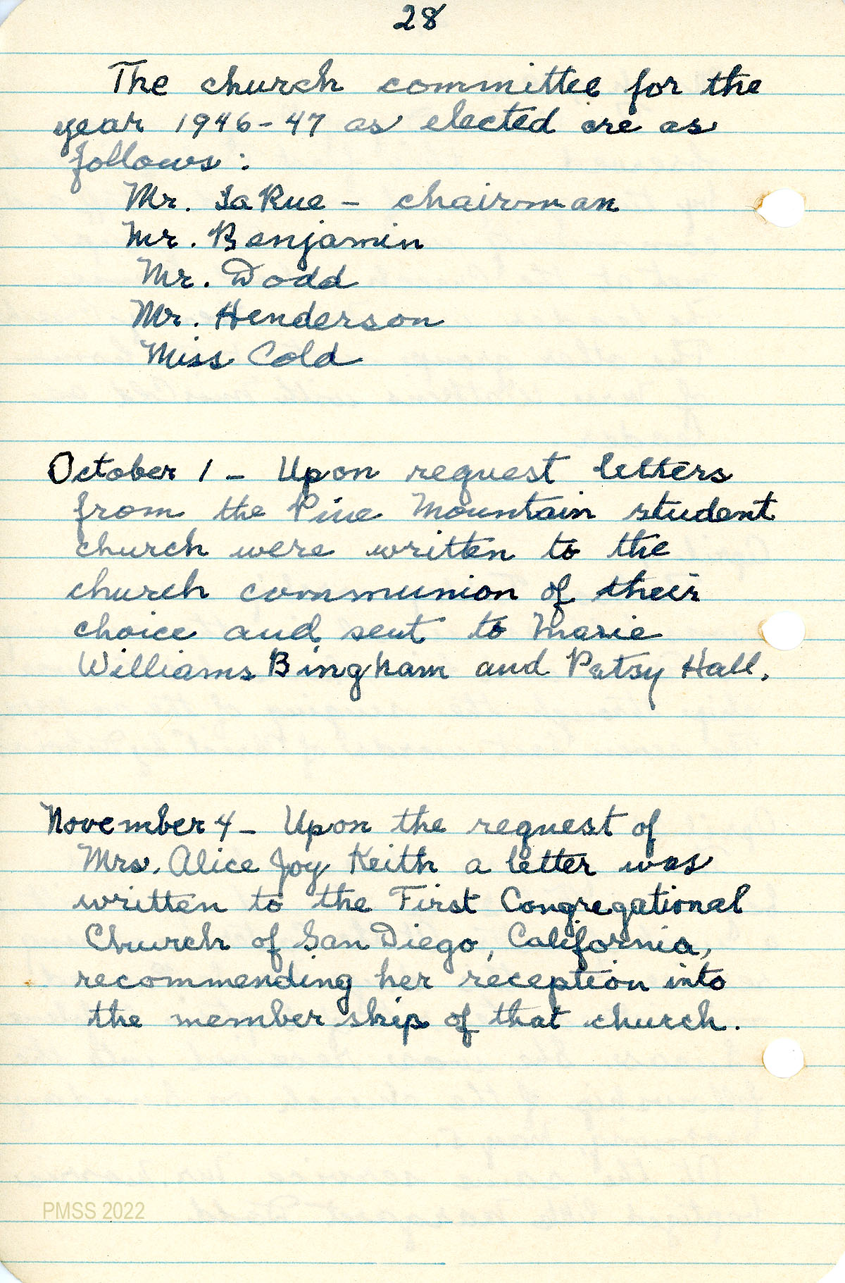 028 Church committee for 1946-37: La Rue (chairman), Benjamin, Dodd, Mr. Henderson, Miss Cold.