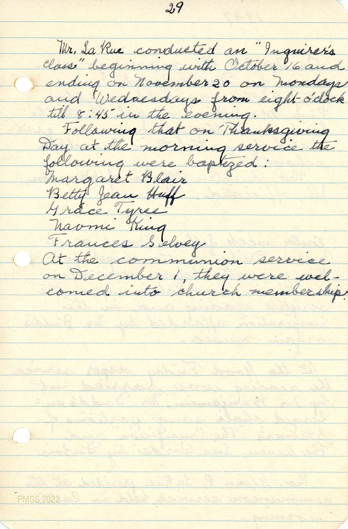 029 La Rue’s Inquirers’ class schedule; baptisms for Margaret Blair, Betty Jean Huff, Grace Tyree, Naomi King, and Frances Selvey.