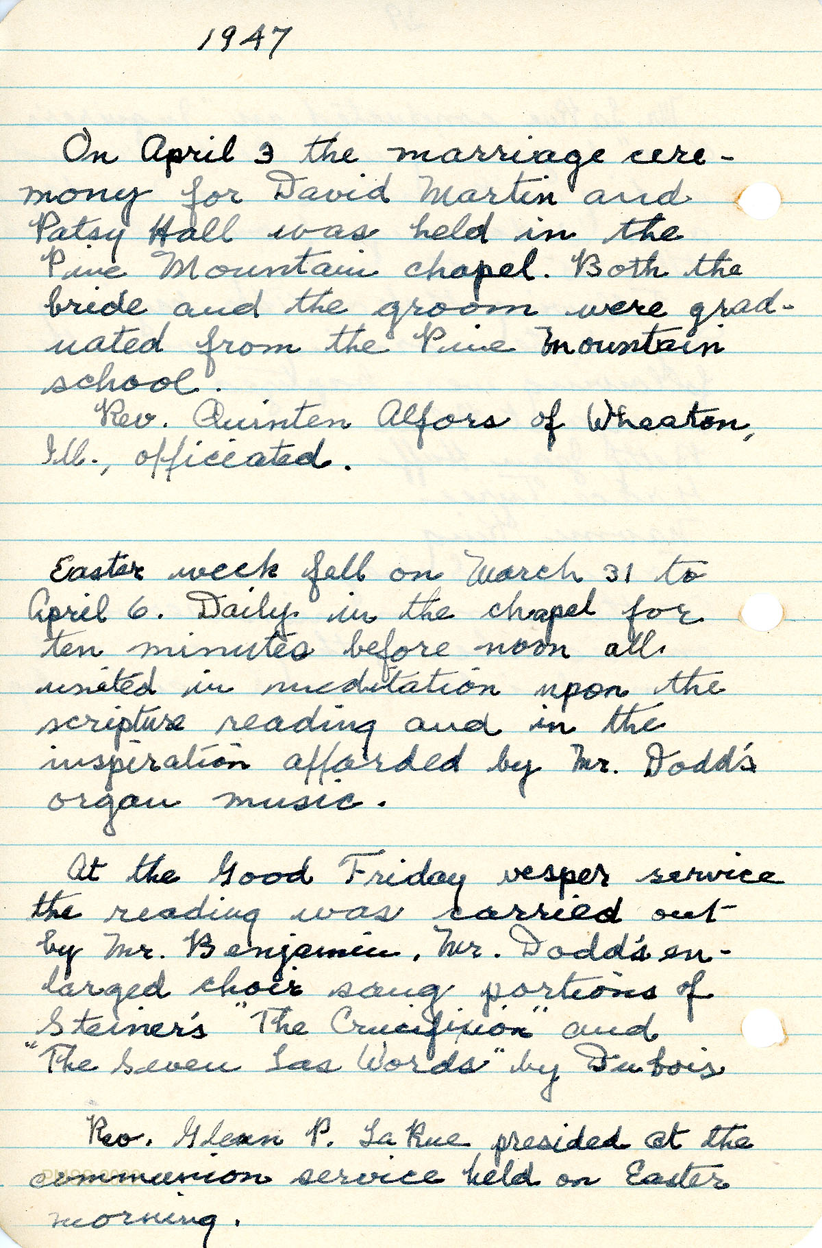 Good Friday – Vesper service reading by Mr. [H.R.S.] Benjamin; Dodd’s choir. Rev. Glenn P. LaRue presided at the communion service on Easter morning.