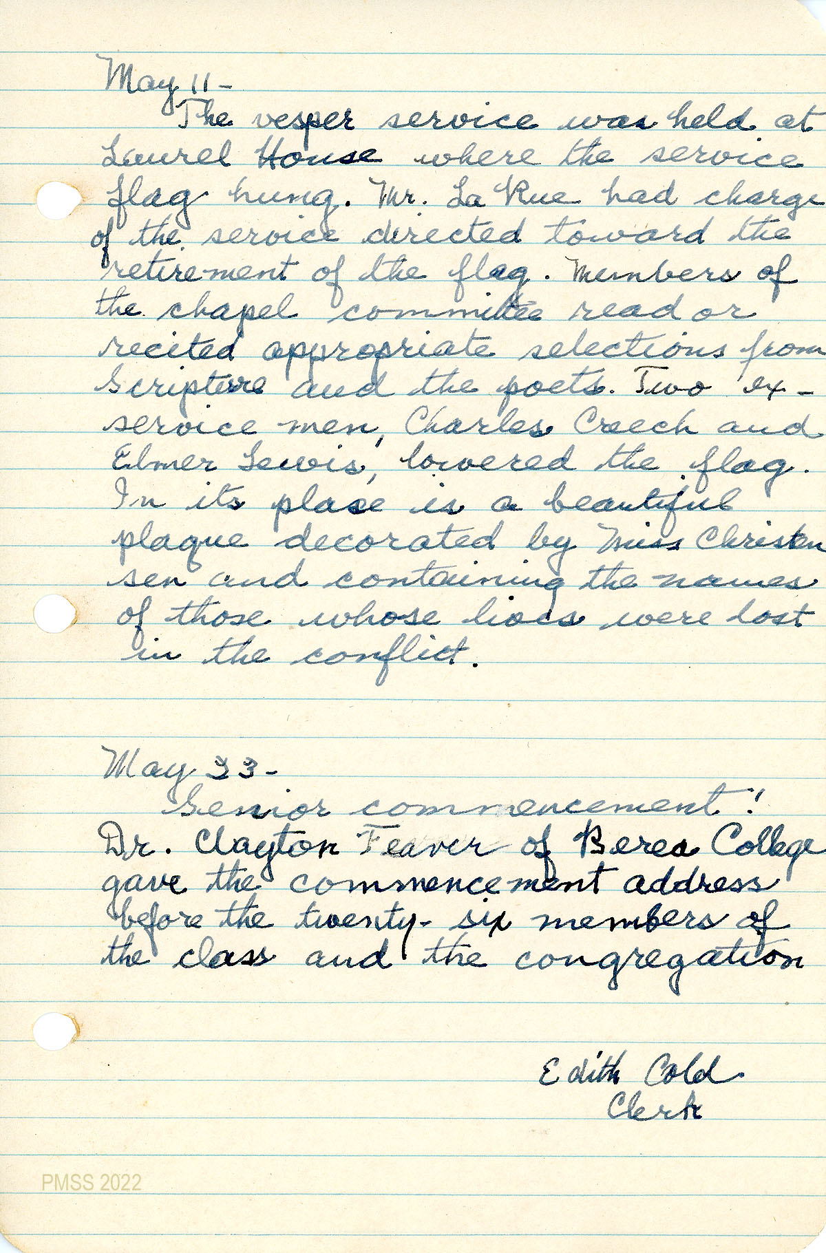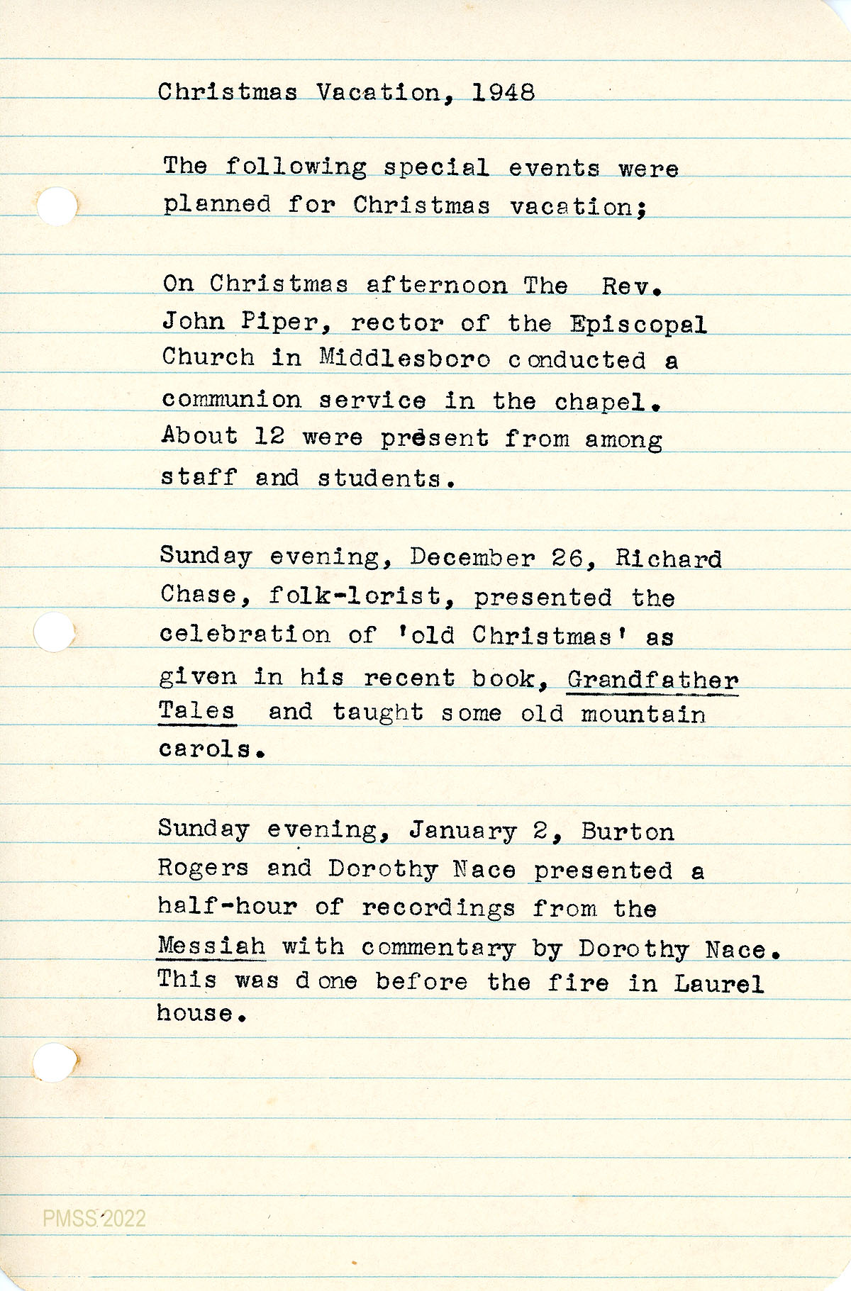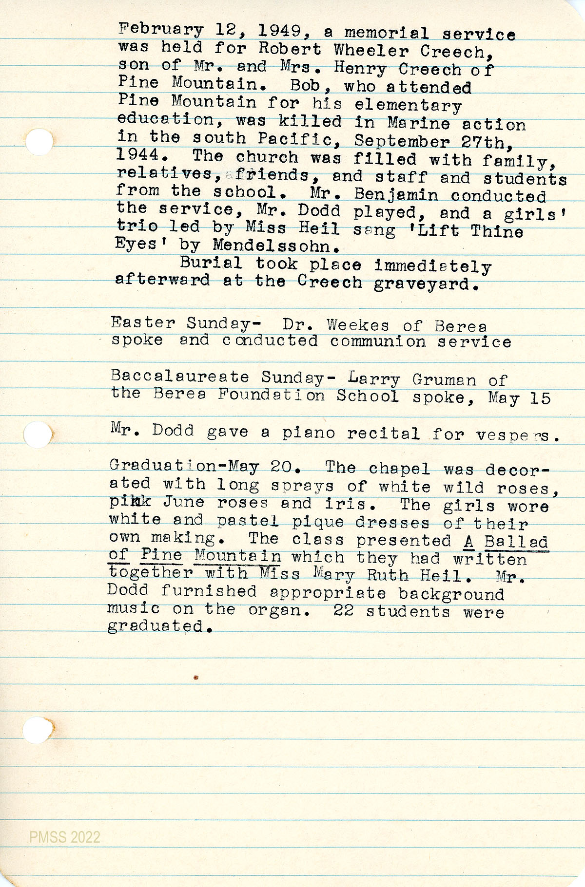 046 February 12, 1949: Memorial service for Robert Wheeler Creech, (son of Mr. and Mrs. Henry Creech) killed in Marine action in the south Pacific; Easter Sunday observation; Baccalaureate Sunday speaker and recital; graduation of 22 students on May 20 during which “[t]he class presented ‘A Ballad of Pine Mountain’ which they had written together with Miss Mary Ruth Heil.”