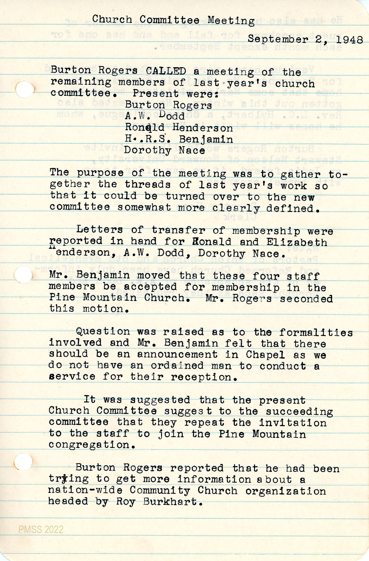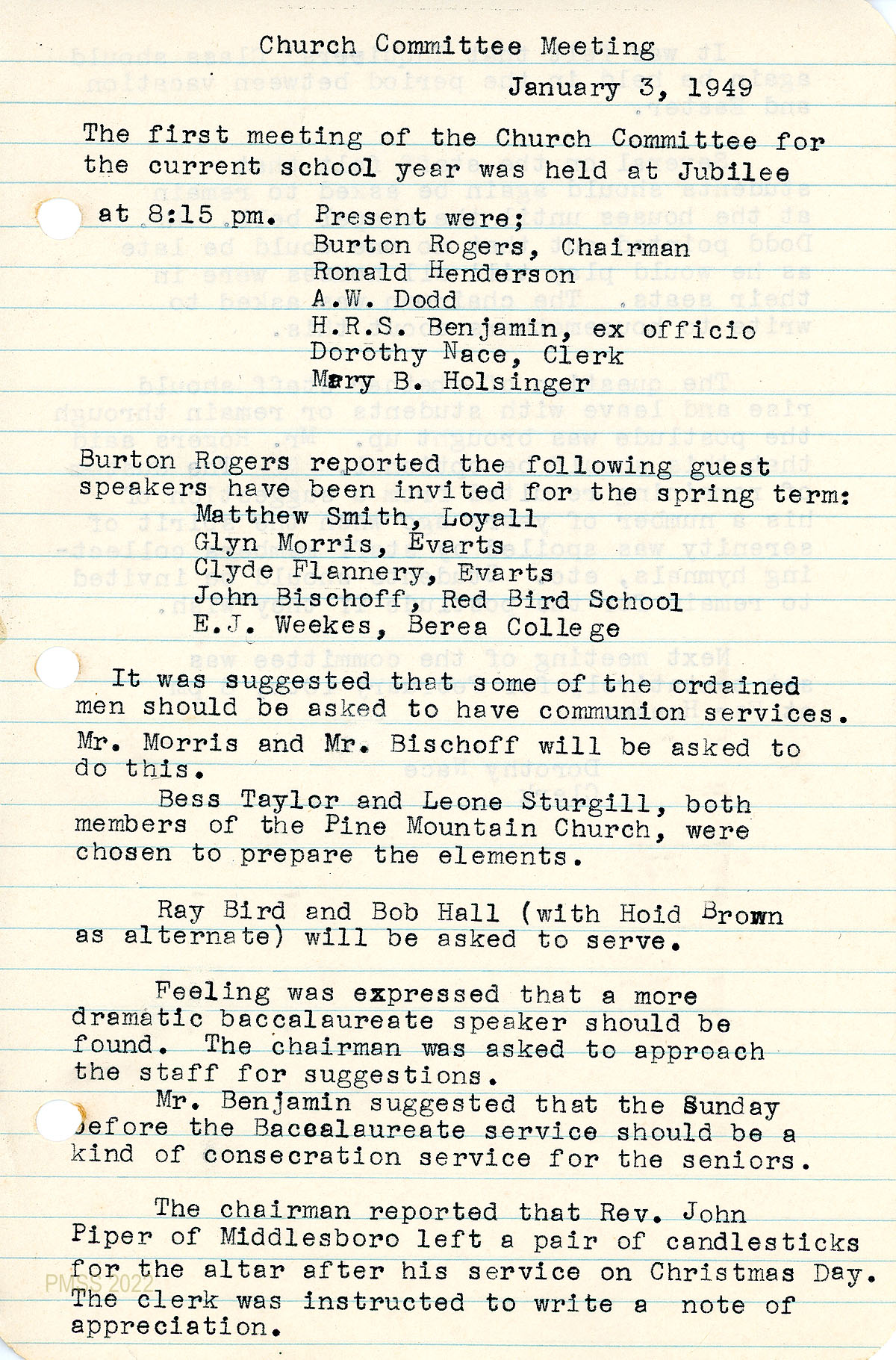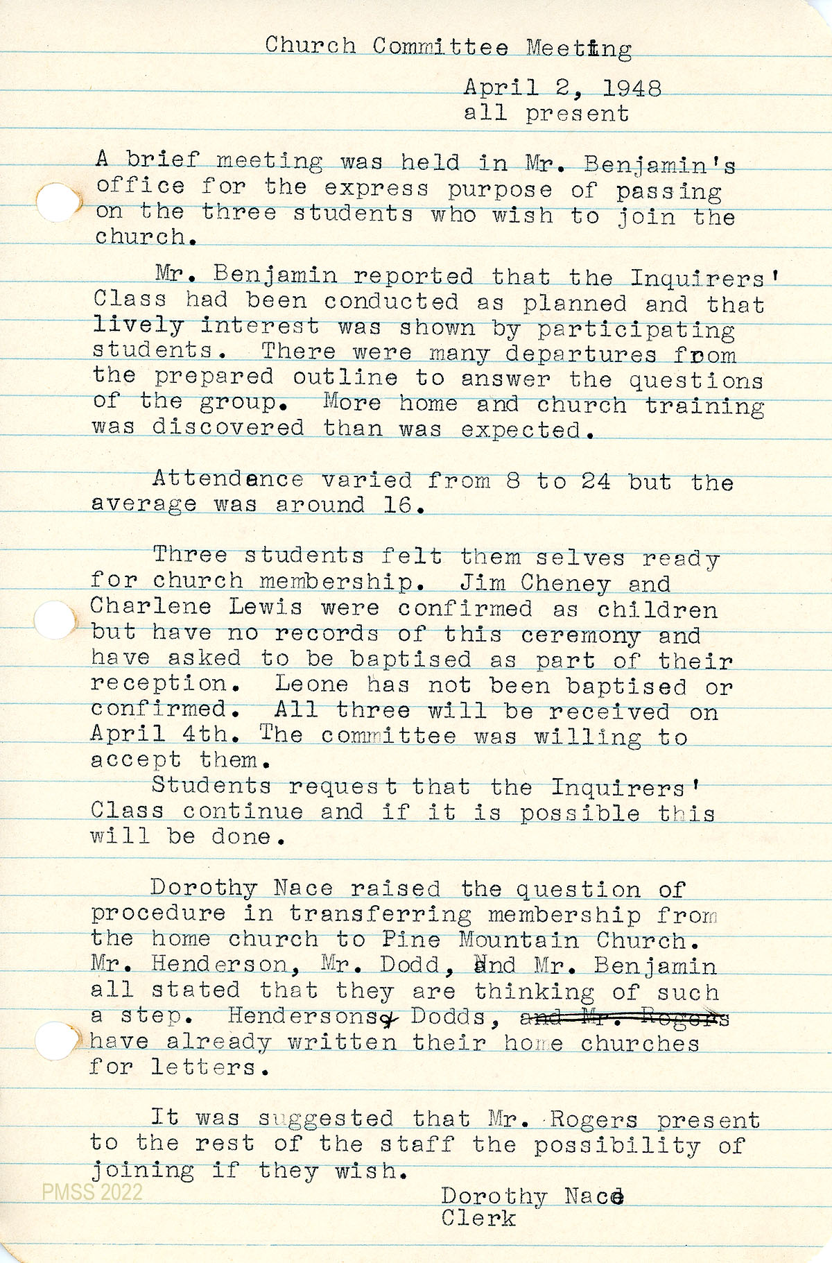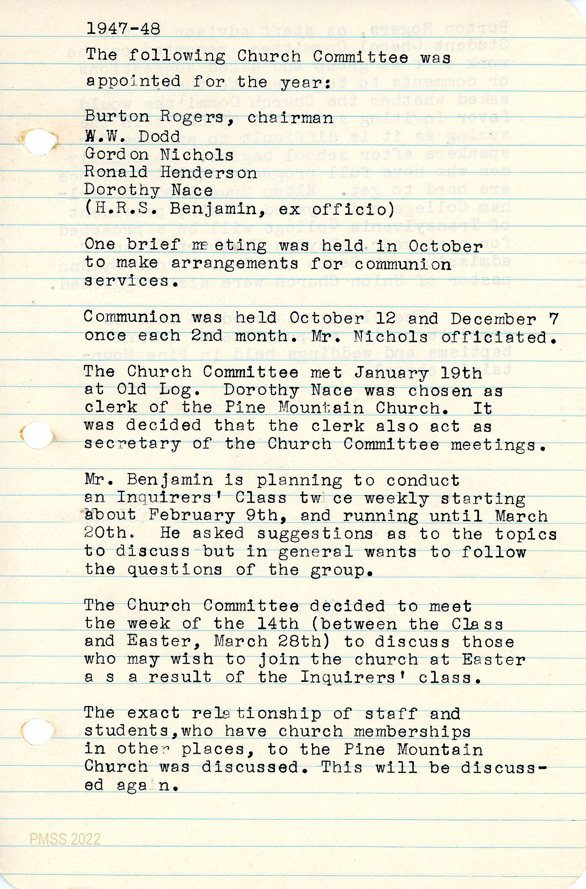 October meeting; communion officiated by Mr. Nichols; January meeting in Old Log during which Dorothy Nace was chosen as clerk of the Pine Mountain Church and secretary of the Church Committee meetings. Mr. Benjamin will conduct a Inquirers’ Class; “The exact relationship of staff and students who have church memberships in other places, to the Pine Mountain Church was discussed.”