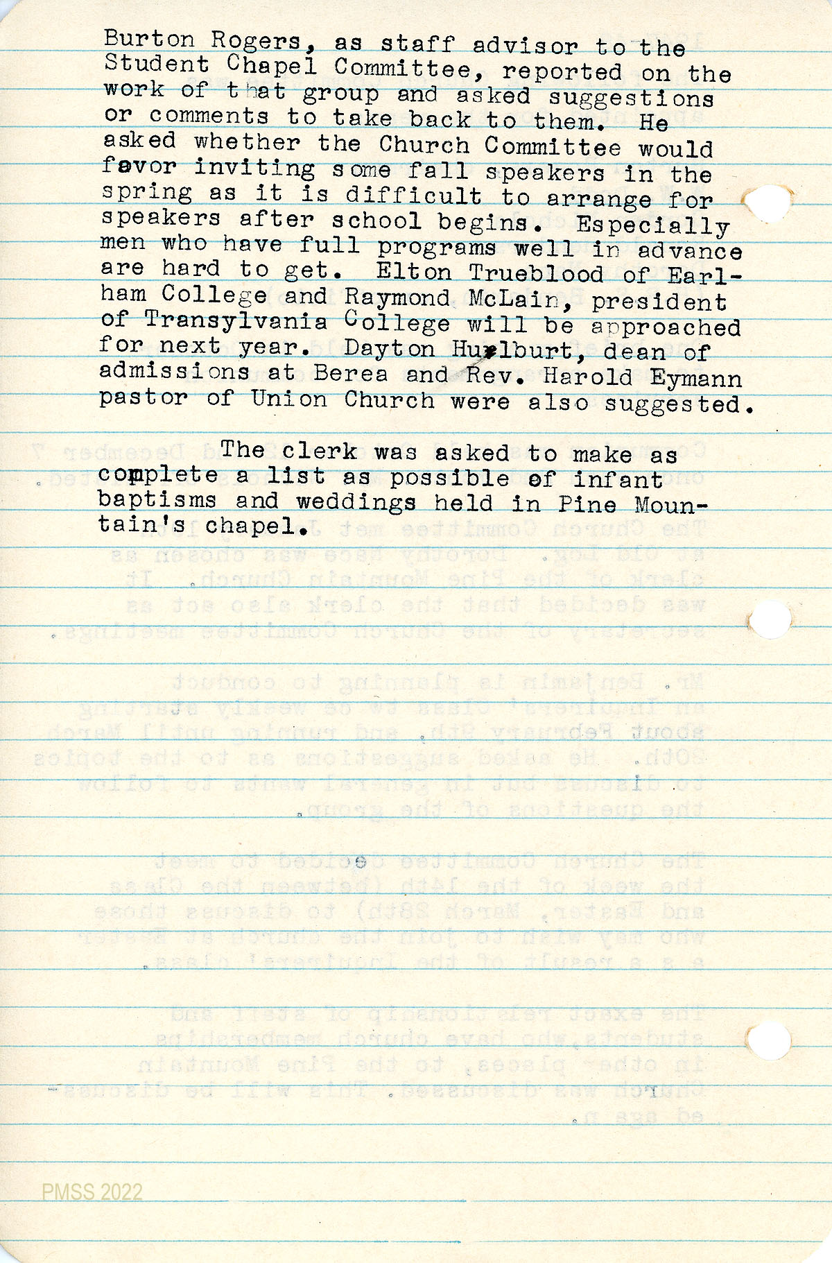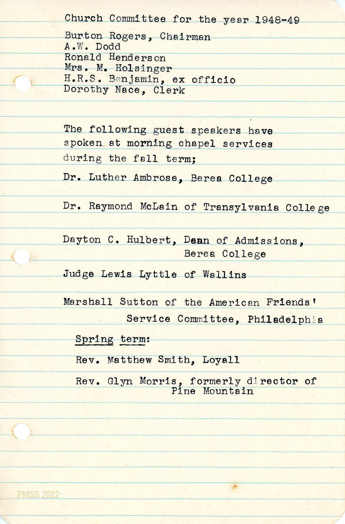 TAGS: Chapel, Pine Mountain School Church, church records, church memberships, Chapel weddings, church baptisms, church transfers, Burton Rogers, Edith Cold, Dorothy Nace, Arthur Dodd, H.R.S. Benjamin, church and community, church committee, WWII, Glenn LaRue, holiday observances, vesper services, service flag, memorial plaque by Miss Christensen, Inquirers’ Class, church music, guest speakers, 1949 graduation