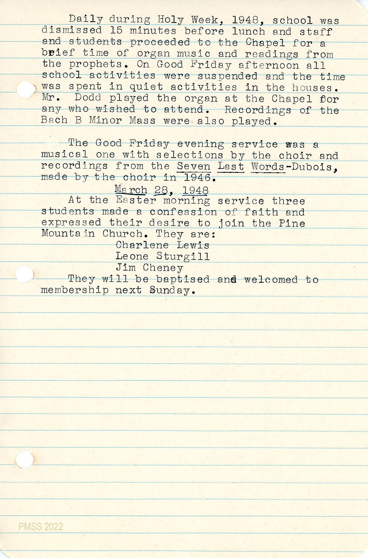 March 28, 1949. Easter observances: Three students joined the Pine Mountain Church: Charlene Lewis, Leone Sturgill, and Jim Cheney.