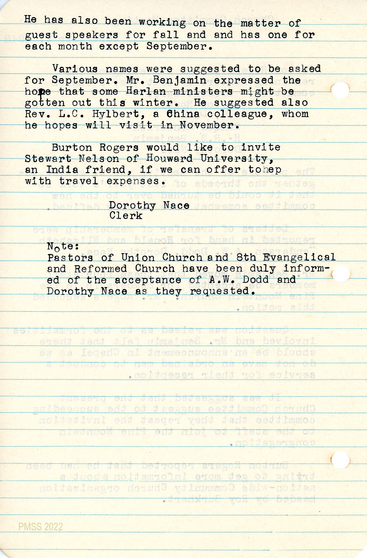 036 September 3, 1948. Church Committee Meeting recorded by Dorothy Nace, Clerk. Burton Rogers called a meeting of last year’s church committee for a review of the previous year’s work. Present were: Rogers, Dodd, Ronald Henderson, Benjamin, Nace. Letters of transfer were done for the Hendersons, Dodd, and Nace. “Burton Rogers reported that he was trying to get more information about a nation-wide Community Church organization….” 037 and is working on getting guest speakers and listed suggestions.