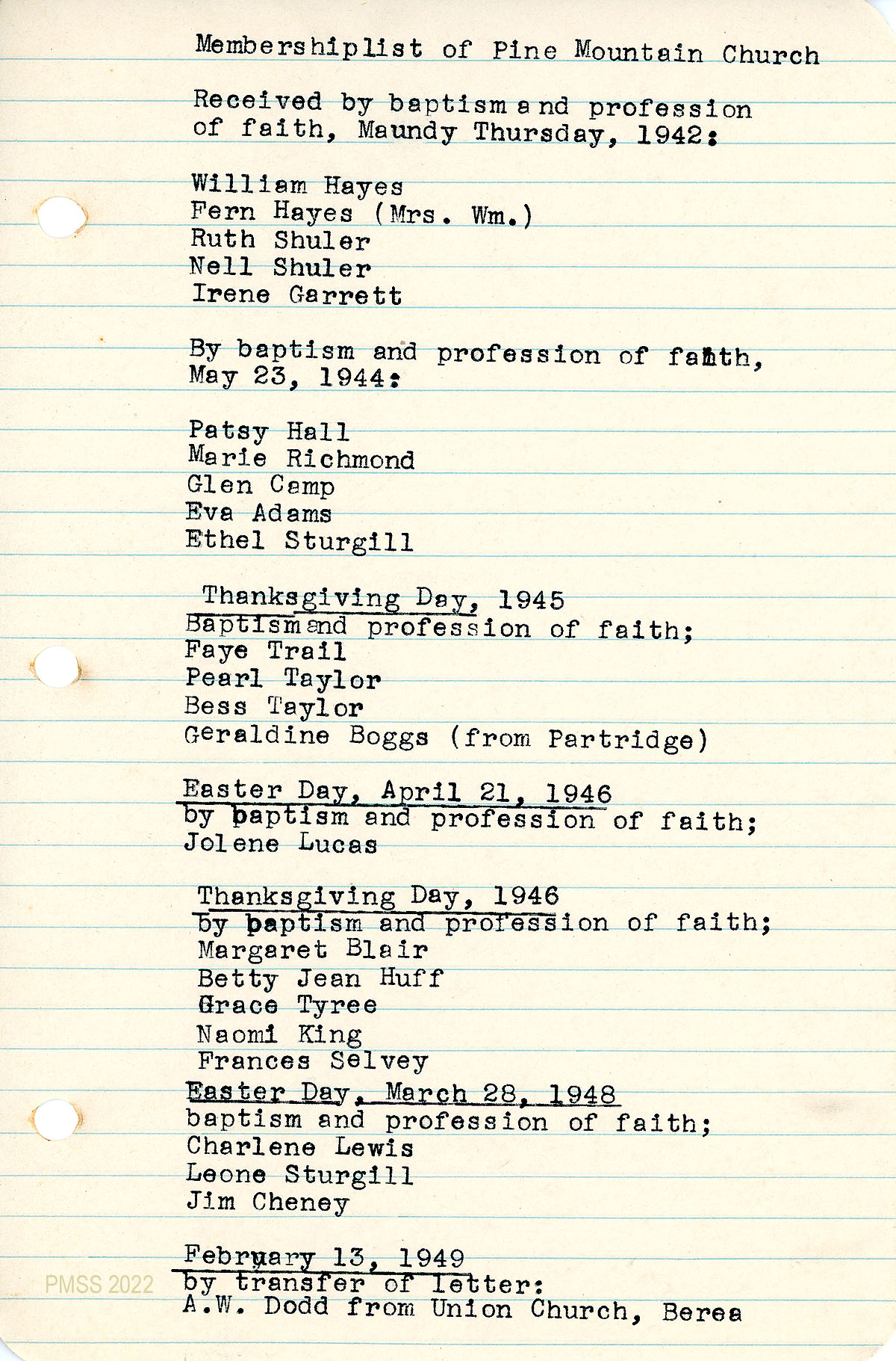 038 Membership list of Pine Mountain Church. 1942, 1944, 1945, 1946, 1948, 1949.