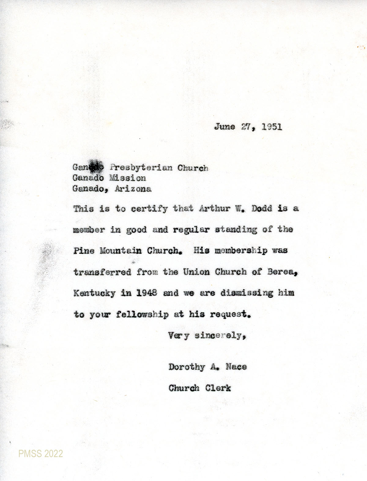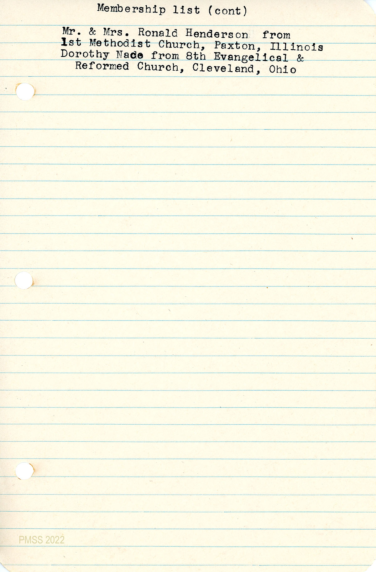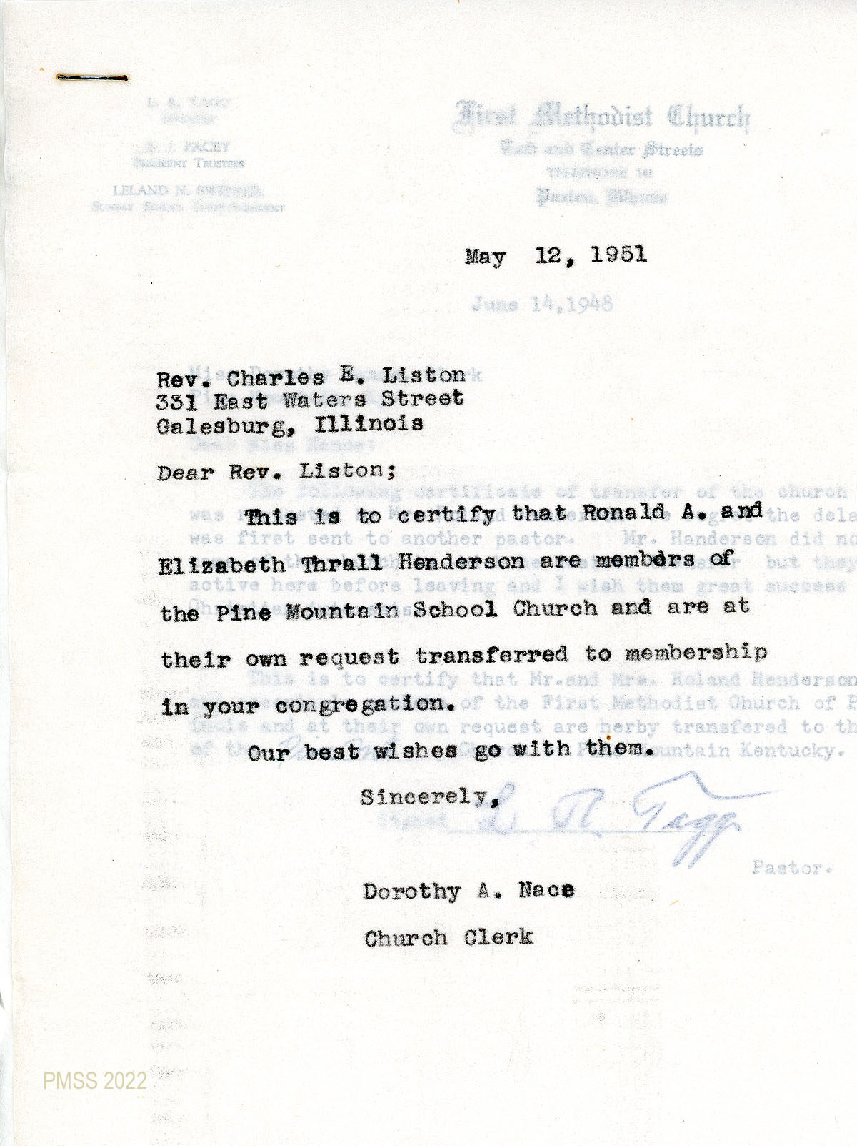 062 May 12, 1951. Letter of transfer to Rev. Charles E. Liston, Galesburg, IL, from Nace, certifying that Ronald A. and Elizabeth Thrall Henderson are members of the Pine Mountain School Church who have asked to be transferred to his congregation.