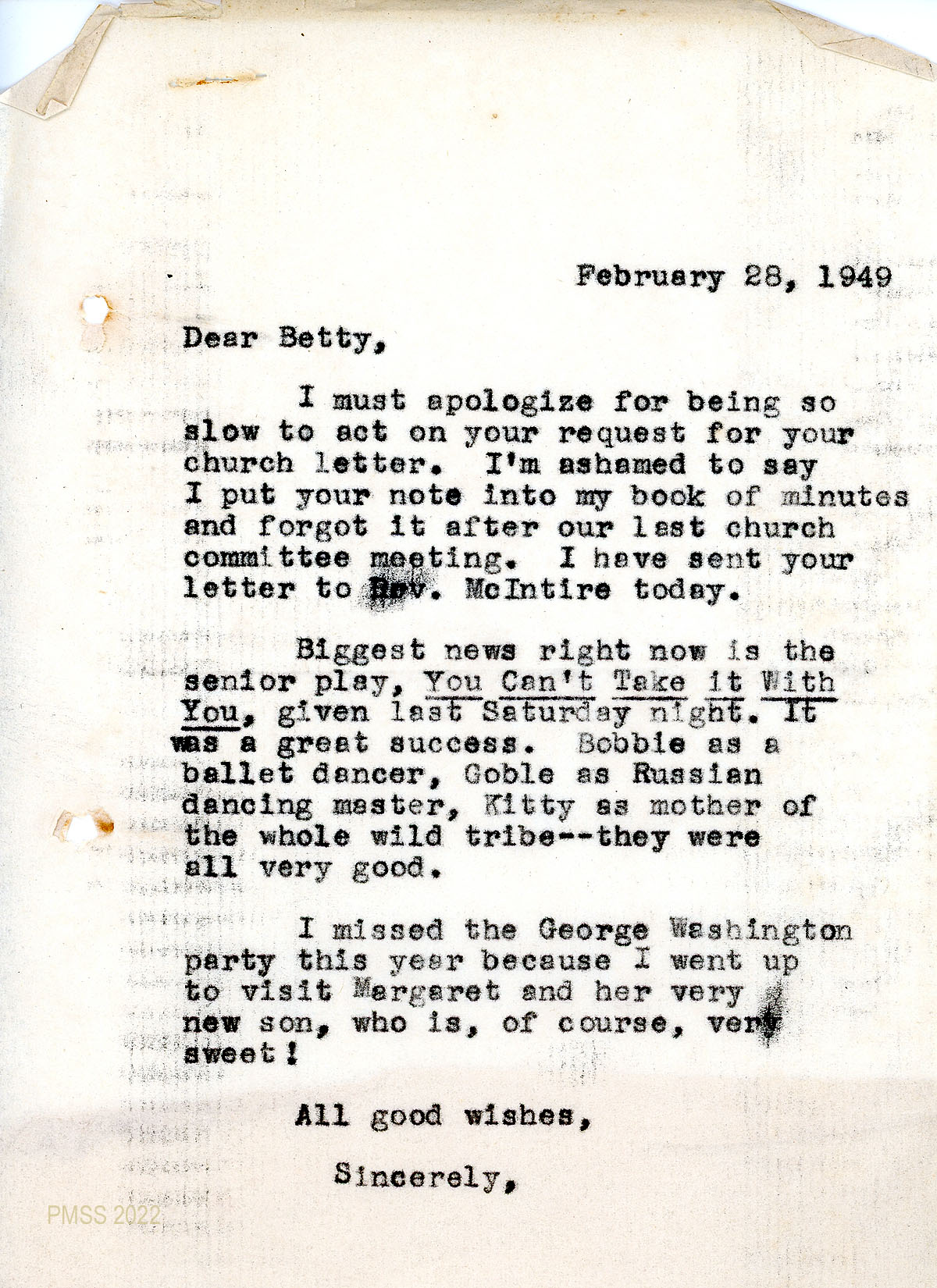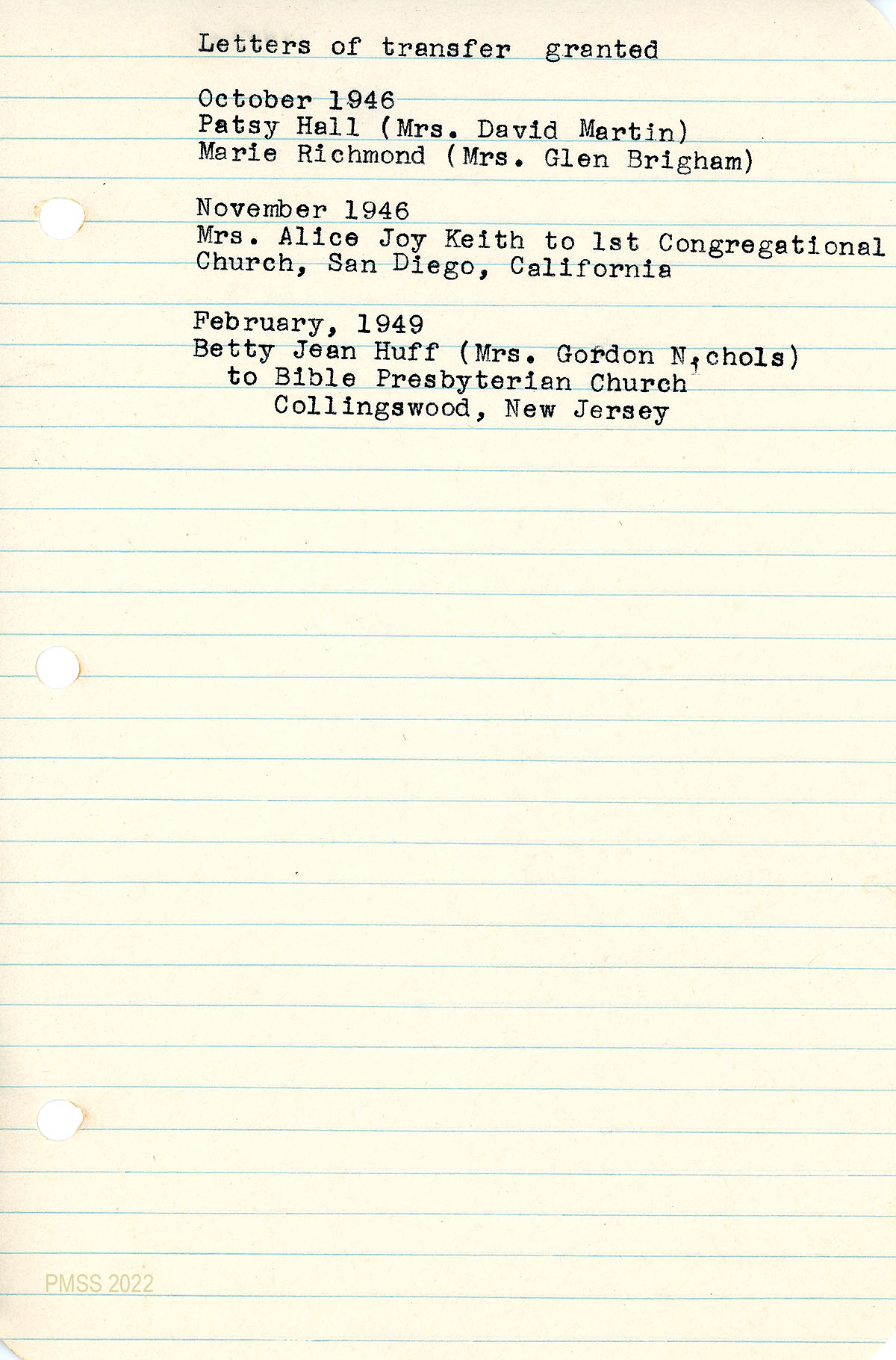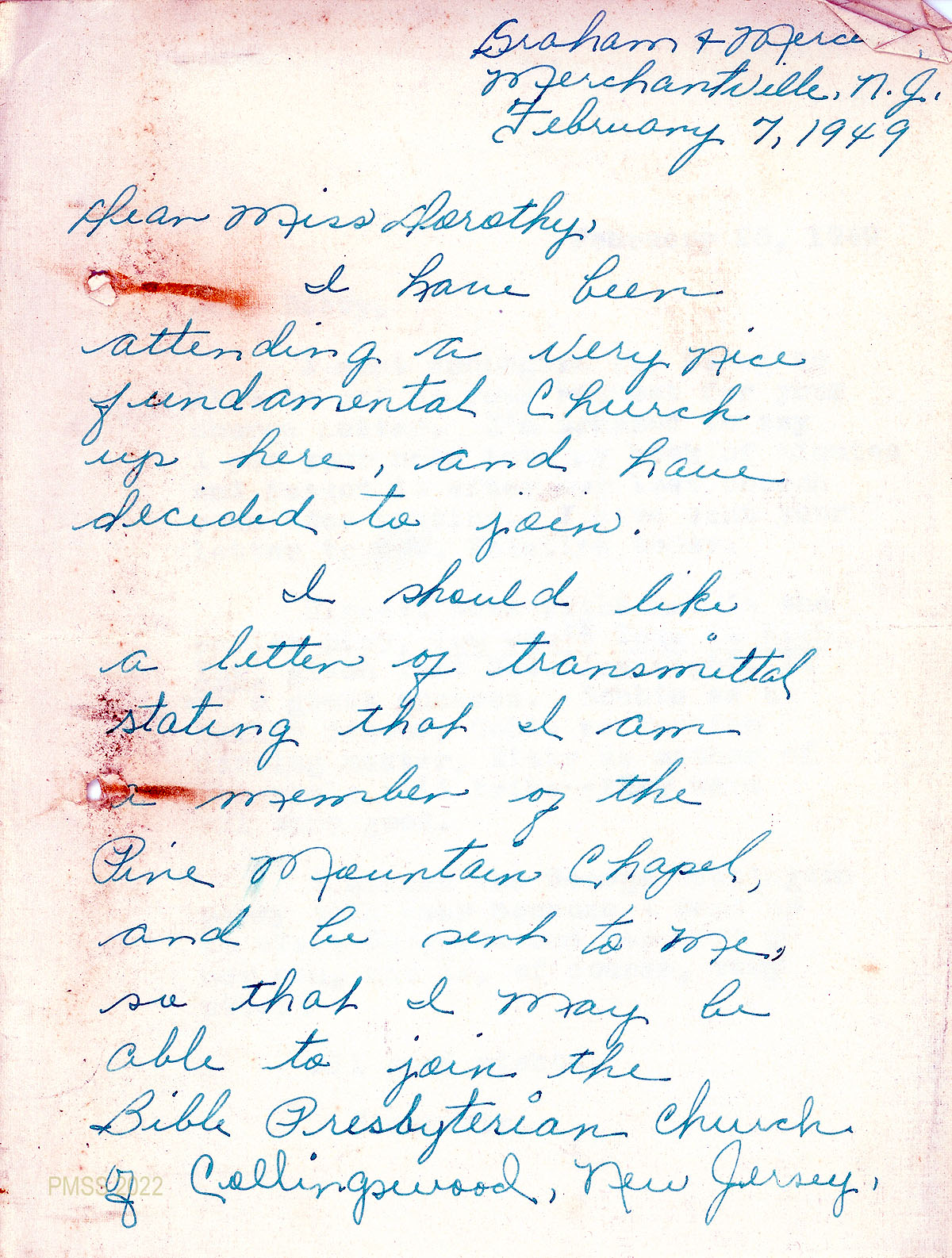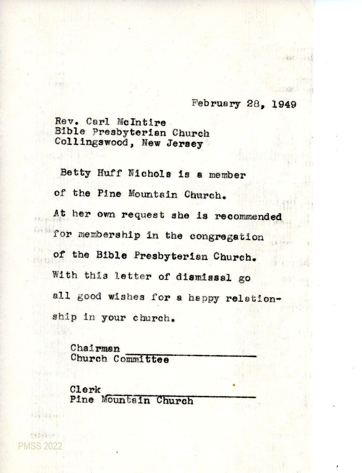 060 February 28, 1949. Carbon copy of a “letter of dismissal” to Rev. Carl McIntire, Bible Presbyterian Church Collingswood, NJ, from [unsigned], Chairman of the Church Committee and Clerk of Pine Mountain Church for Betty Huff Nichols, former member of the Pine Mountain Church.
