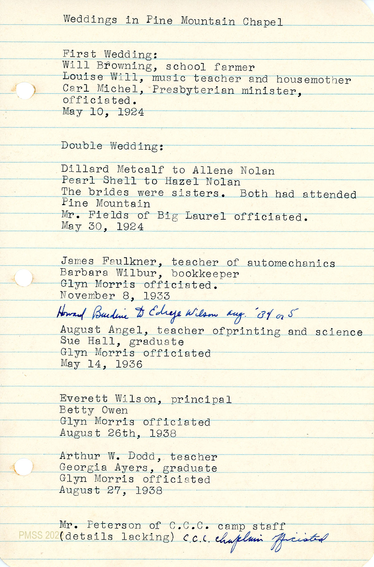 “First Wedding: May 10, 1924, Will Browning, school farmer [and] Louise Will, music teacher and housemother, Carl Michel, Presbyterian minister, officiated” and others.