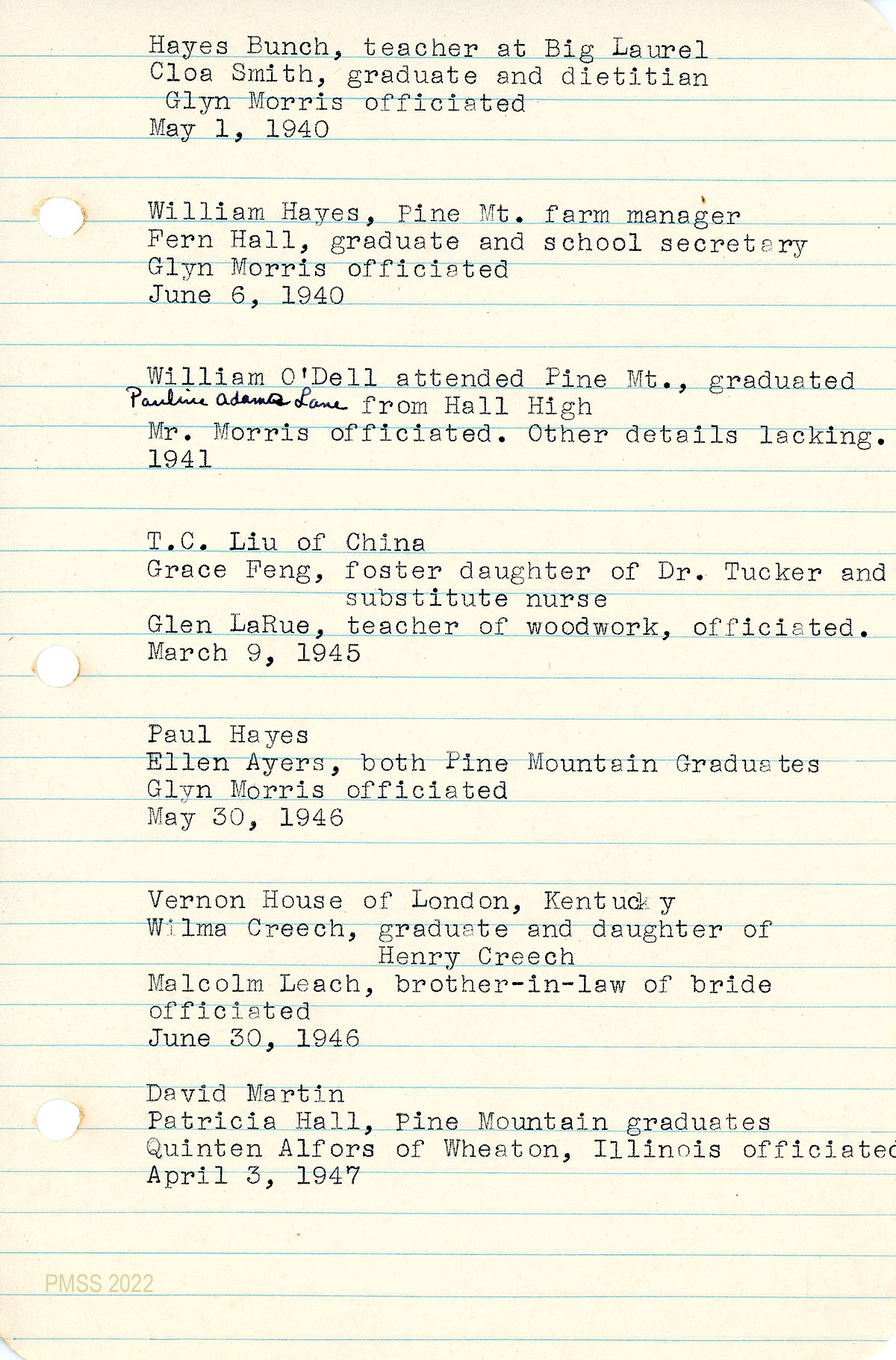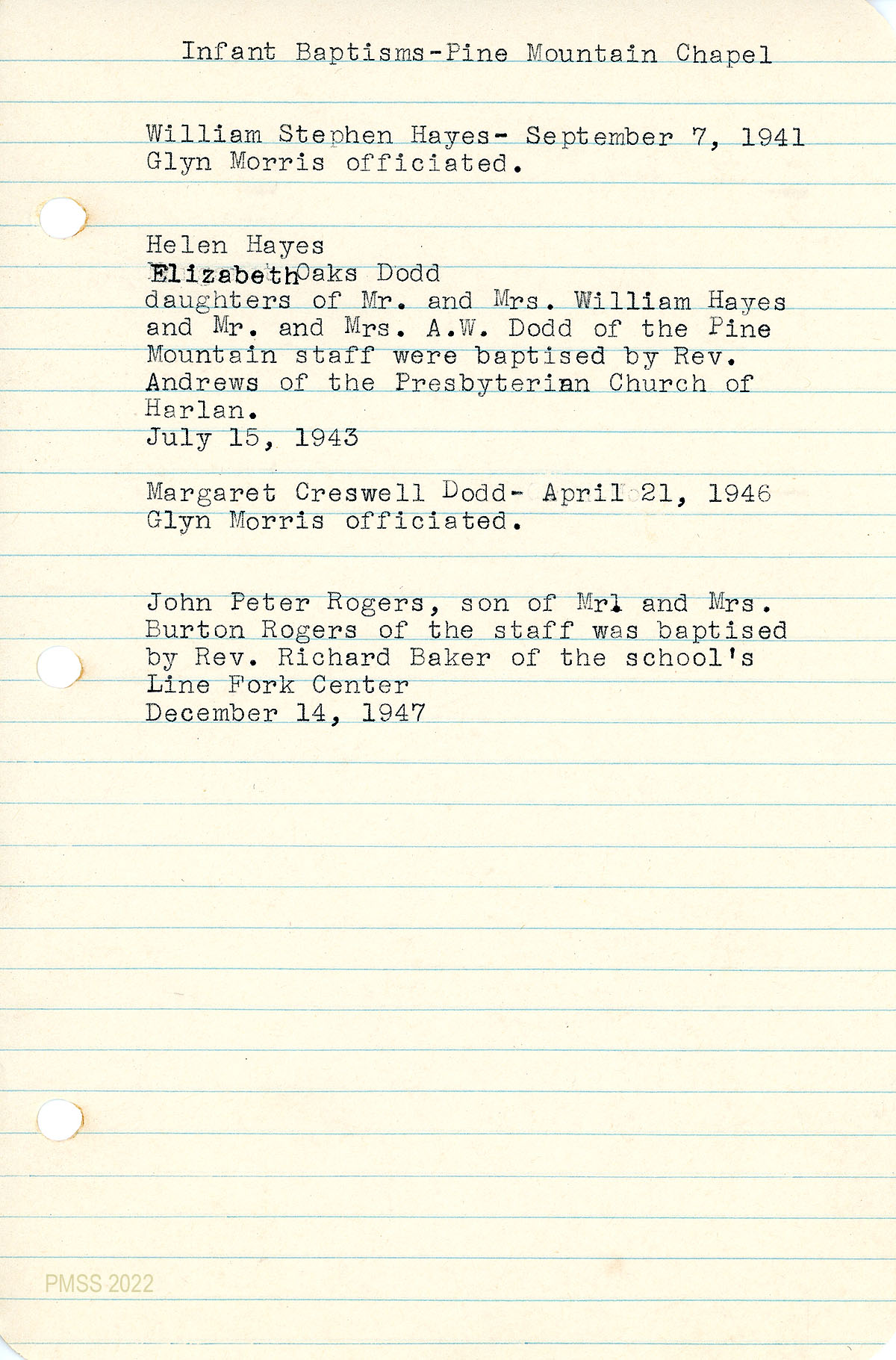 The PMSS Records of Church Memberships, Baptisms, Weddings, etc., were largely documented by Edith Cold, Grace Rood, and Dorothy Nace. They focused on the later Pine Mountain Boarding School years from approximately 1941 until the closure of the Boarding School in 1949. This is part II, covering 1947-1949 (plus two letters dated 1951 and 1964), of a two-part series. The first part covers 1941-1946.