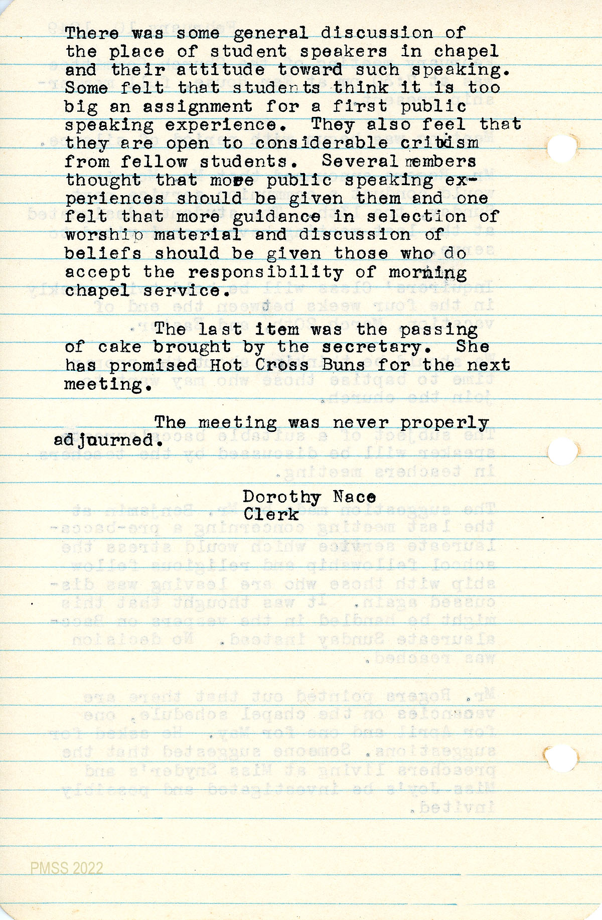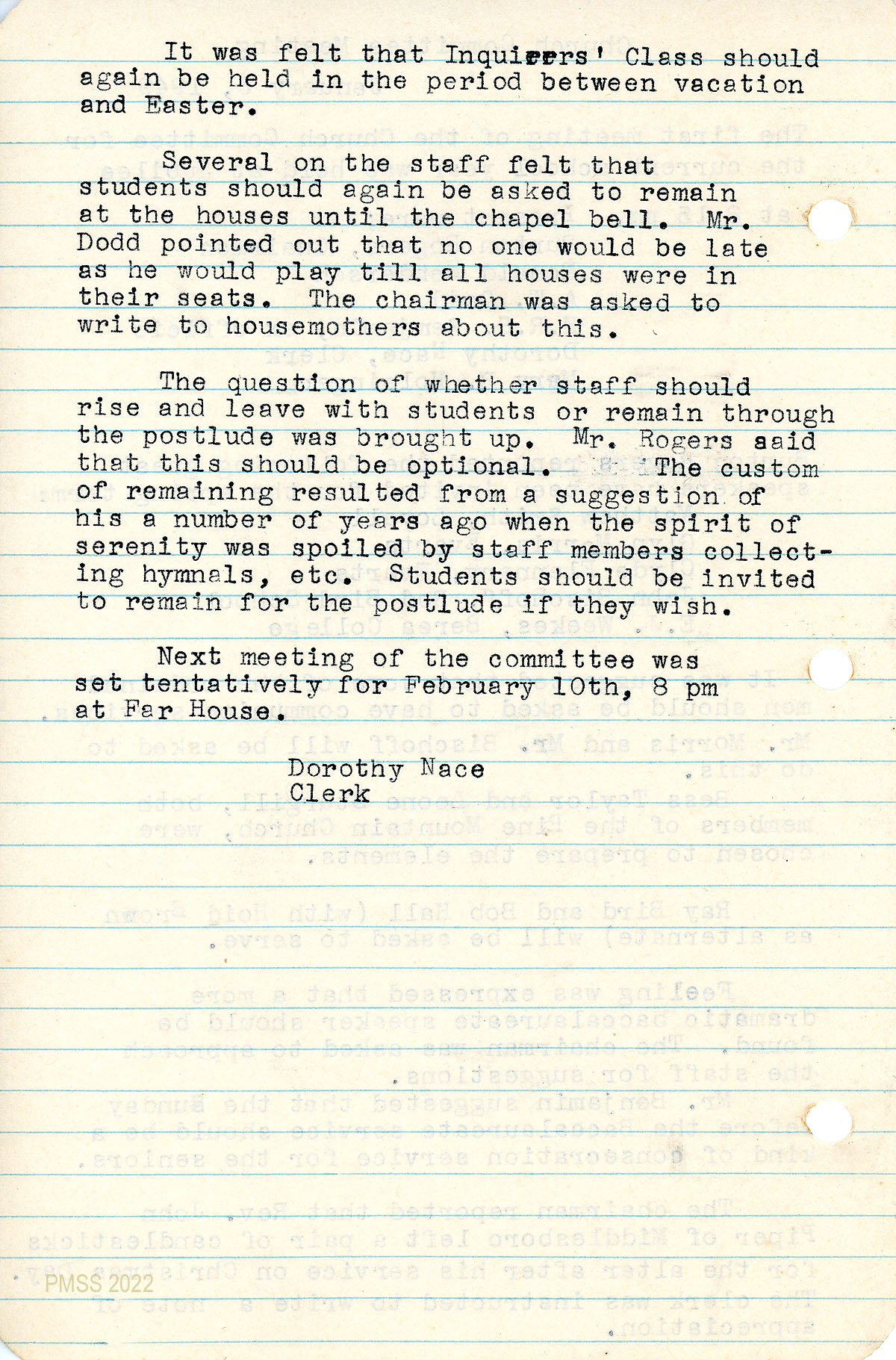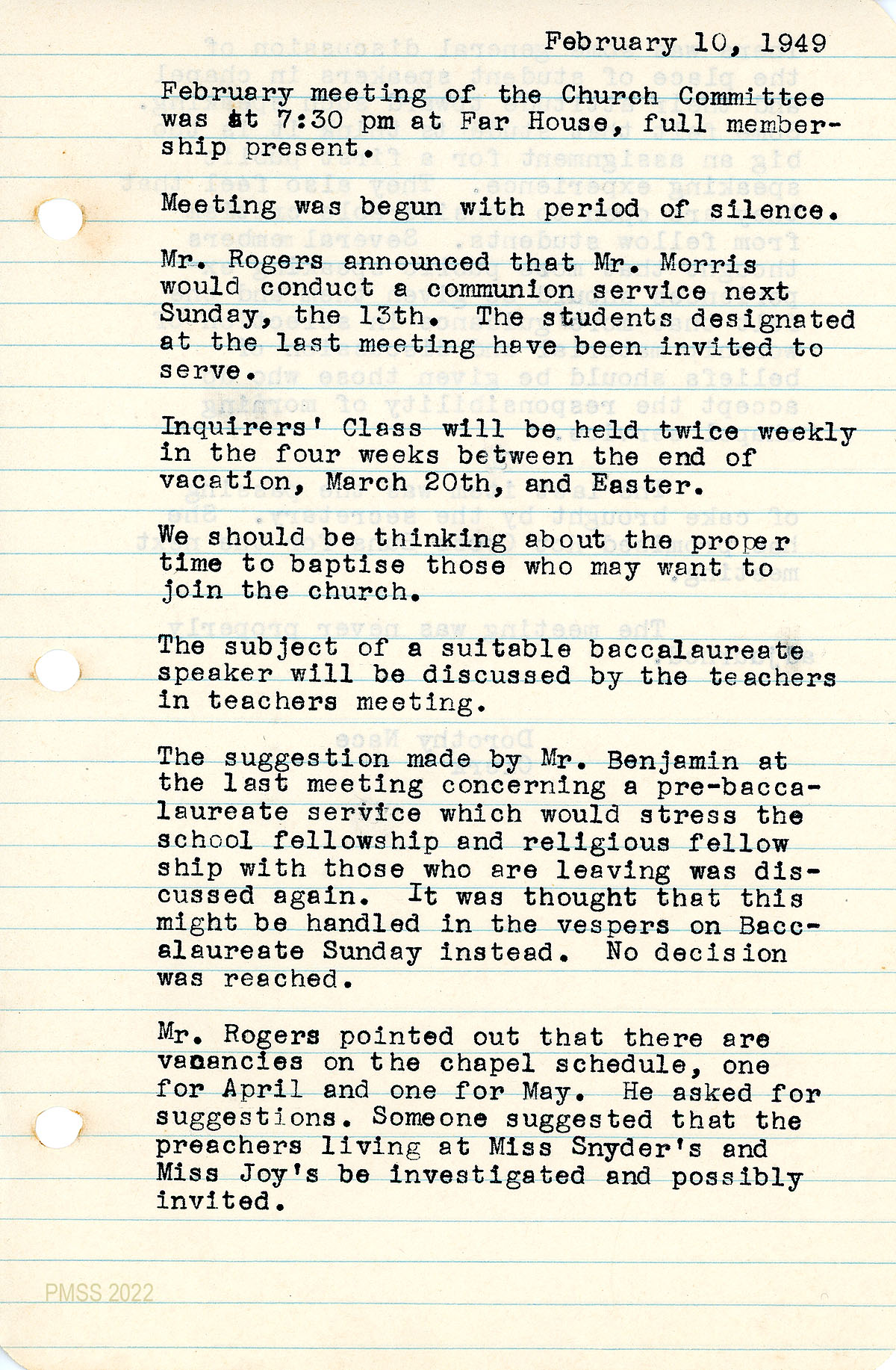 050 February 10, 1949. Church Committee meeting at Far House recorded by Dorothy Nace, Clerk. Subjects covered: upcoming communion service by Glyn Morris; Inquirers’ Class; search for a baccalaureate speaker; Benjamin’s suggestion of a pre-baccalaureate service; scheduling April and May Chapel services; 051 students’ attitudes towards speaking at Chapel services; members’ suggestions that “more public speaking experiences should be given (students)….”