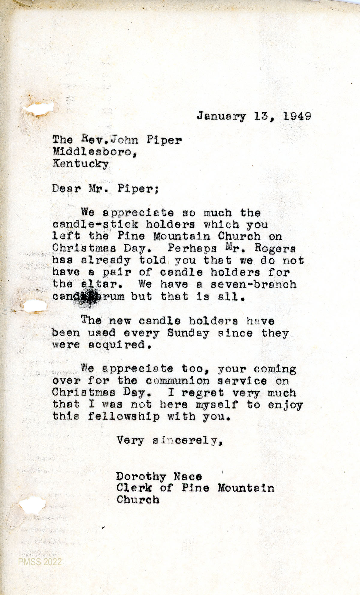 049 January 13, 1949. Letter to Rev. John Piper, Middlesboro, KY, from Dorothy Nace, Clerk of Pine Mountain Church, expressing appreciation for the candlestick holders that he left the Pine Mountain Church on Christmas Day when he officiated at the communion service.
