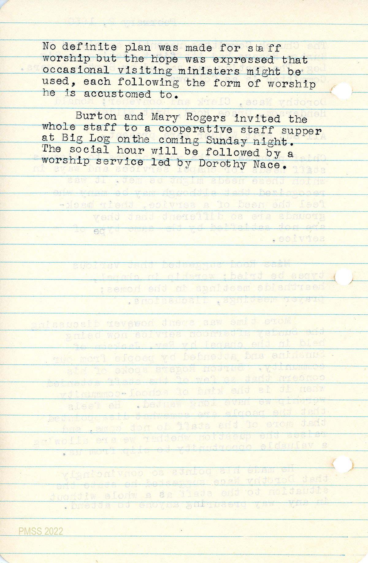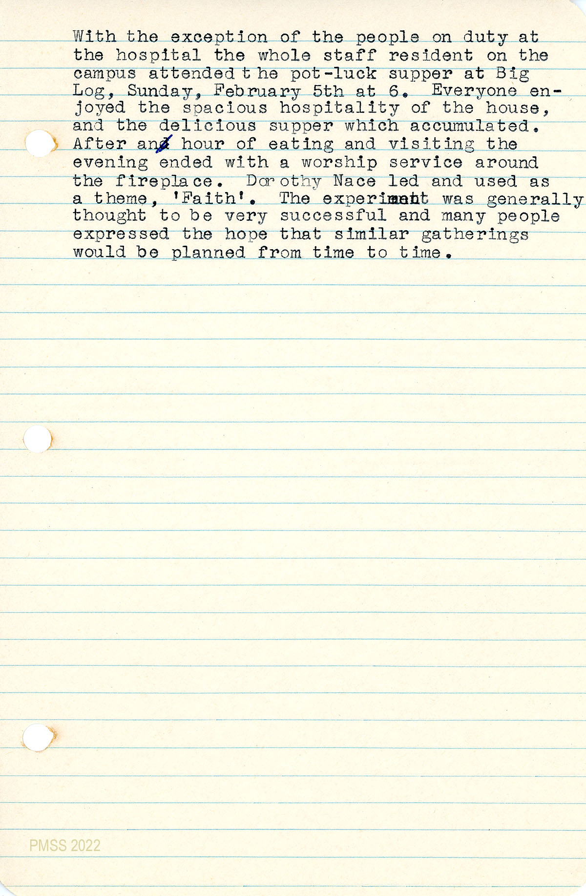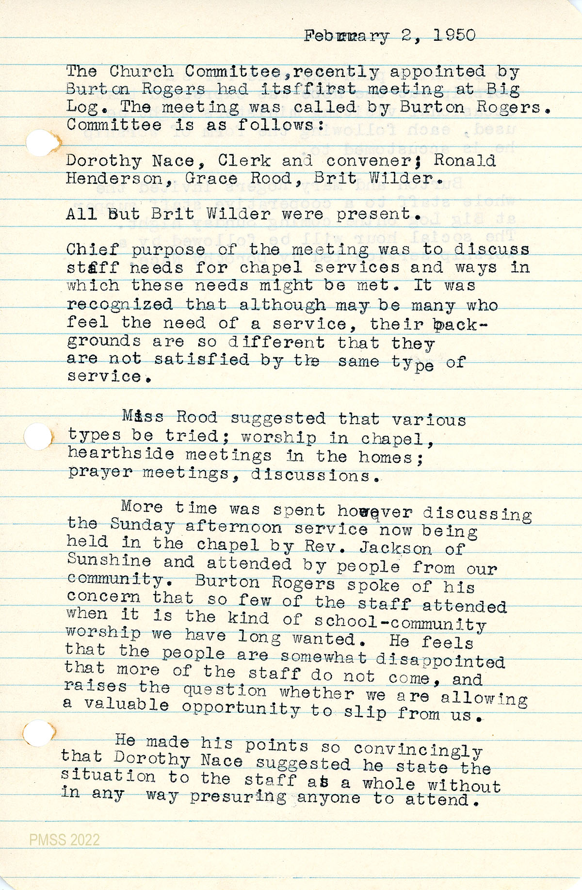 052 February 2, 1950. Church Committee meeting at Big Log; members were Nace (clerk and convener), Ronald Henderson, Grace Rood, Brit Wilder (absent). Discussed: diverse staff needs for Chapel services; lack of staff at Rev. Jackson’s Sunday afternoon service for the community; 053 Burton and Mary Rogers invited staff to a cooperative staff supper at Big Log, followed by social hour and worship service led by Nace.