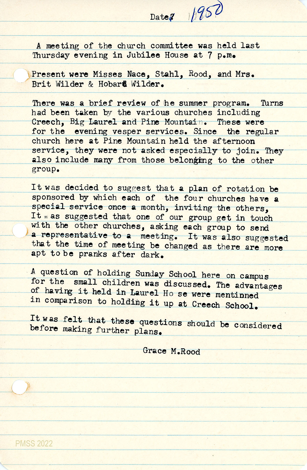055 [No date. Handwritten notation: “1950”] Church committee meeting in Jubilee House, recorded by Rood. Present: Misses Nace, Stahl, Rood, Mrs. Brit Wilder, Hobart Wilder. “Turns had been taken by the various churches including Creech, Big Laurel, and Pine Mountain” for evening vesper services; a rotation plan was suggested. Discussed: Sunday School in Laurel House for small children.