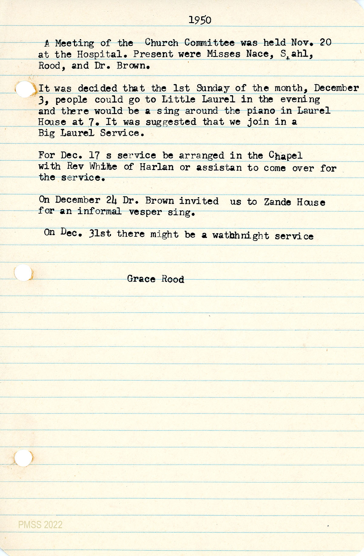 056 November 20, 1950. Church Committee meeting at the Hospital, recorded by Rood. Present: Misses Nace, Stahl, Rood, and Dr. [Gordon] Brown. Discussed; Joining in a Big Laurel service, inviting Rev. White for a December 17 Chapel service; Dr. Brown’s invitation to Zande House for a vesper sing on December 24, possible watchnight service on December 31.