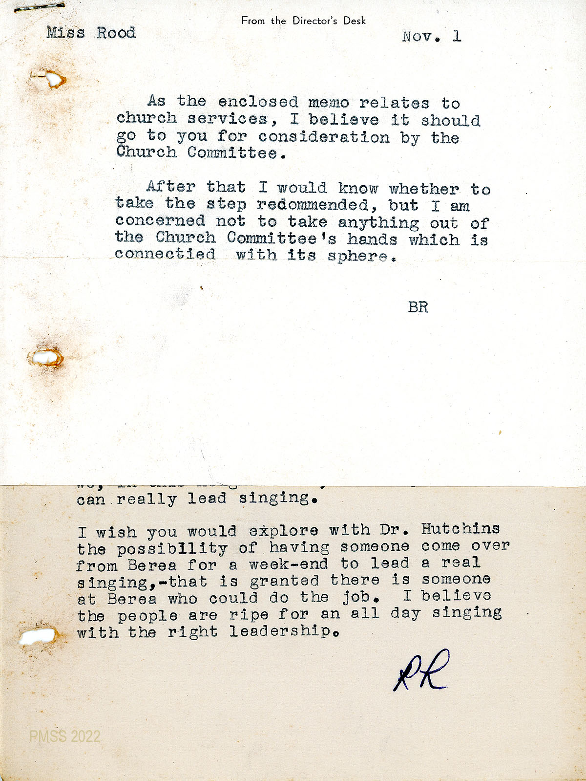 057 November 1, [no year]. A note To Miss Rood from “BR” [Rogers], enclosing a memo about church services, asking for Church Committee’s advice.